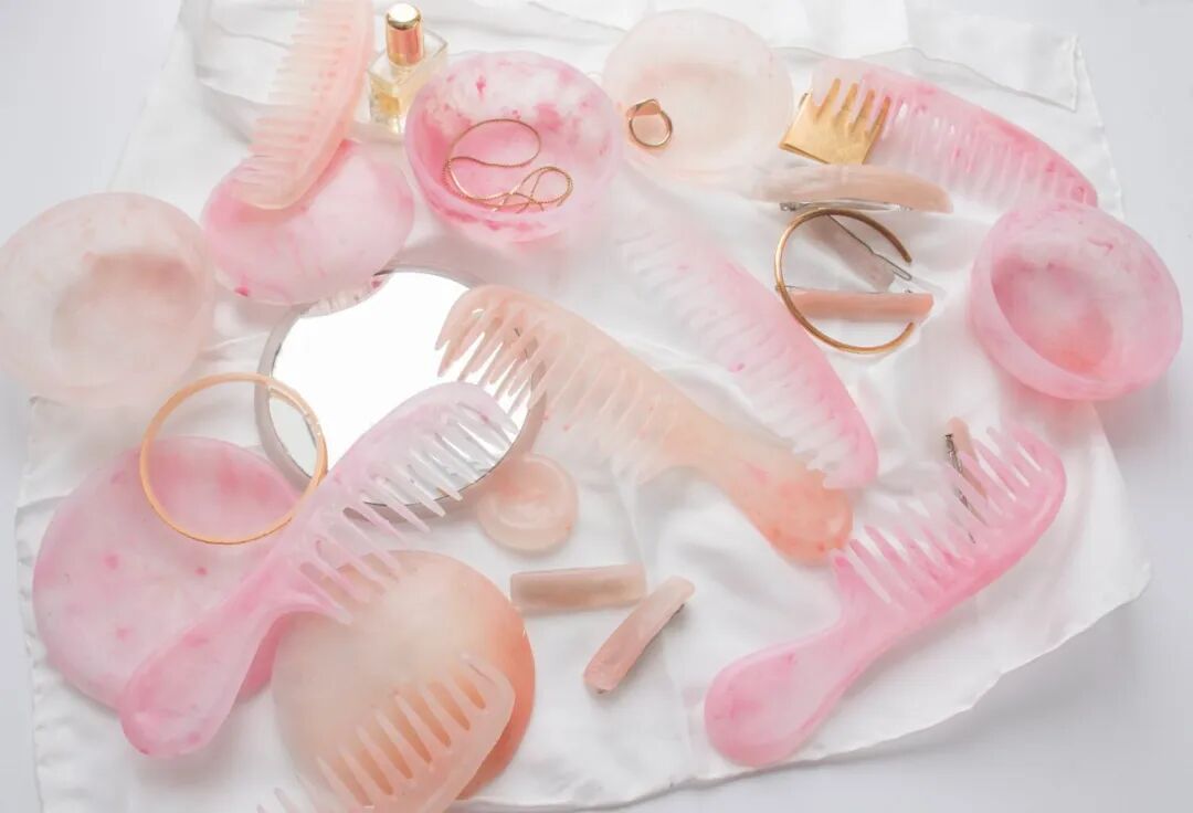 以上产品用收集到的废旧化妆品容器和回收树脂加工而成,显现出娇嫩的桃粉色。