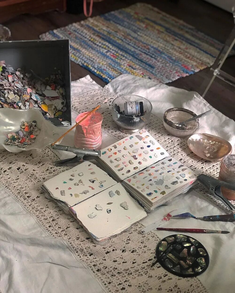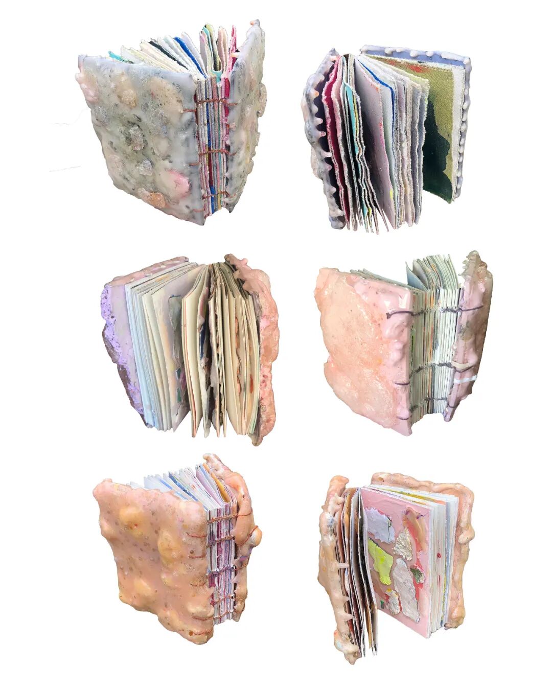 她用上釉的瓷碎片混合石料以及混凝土模拟成充满奇幻色彩的贝壳形状,用流动形状的环氧树脂做出没有文字的书,创造出有机和人造结合的艺术品。