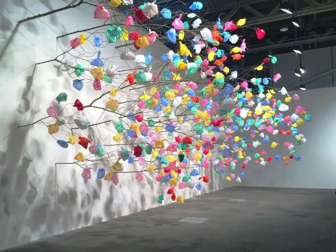 2015 年瑞士巴塞尔艺术展上呈现的喀麦隆艺术家 Pascale Marthine Tayou 的《塑料树》。