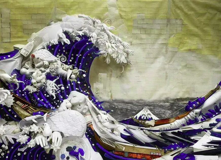法国的Bernard Pras用一堆形状各异的废塑料再现葛饰北斋的《神奈川冲浪里》