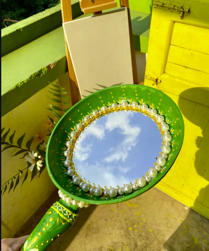 此面墙镜由回收树脂制成,色彩柔和、呈现半透明质地,带有手工制作特有的粗粝感和发光的缎面效果。