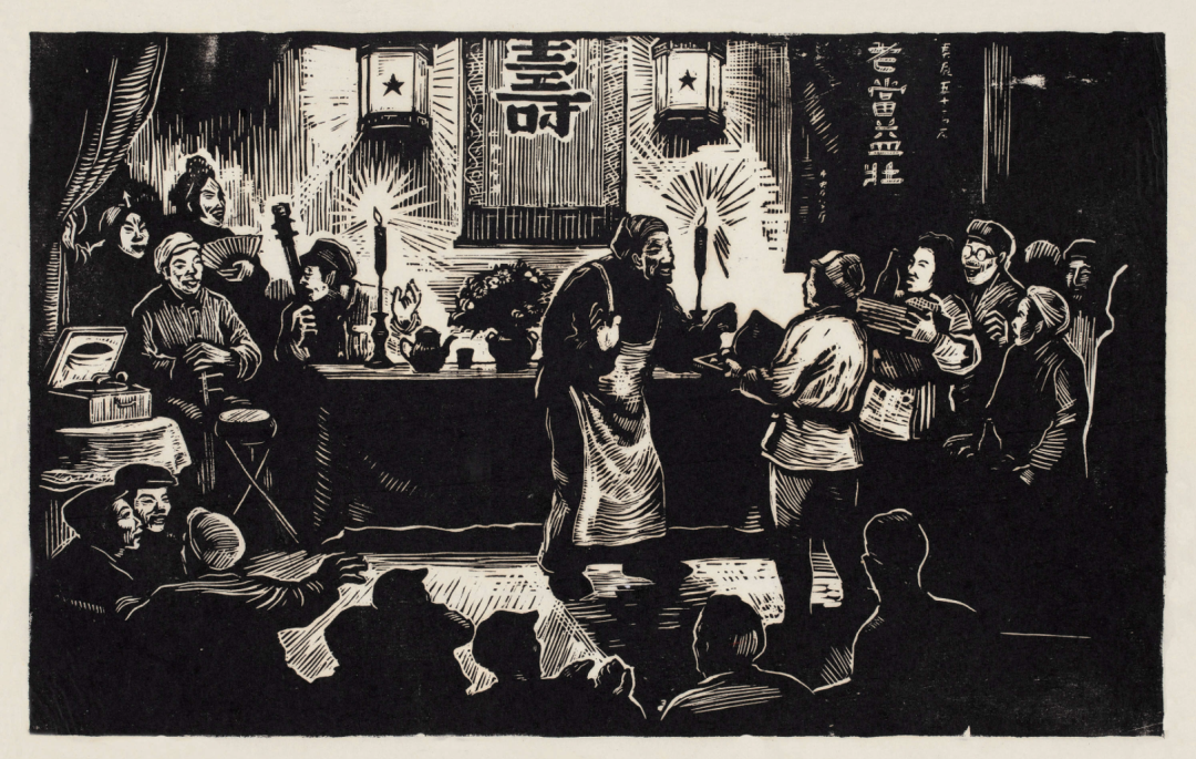 古元,老炊事员的寿辰,16.5 x 25 cm,木刻纸本,1944年