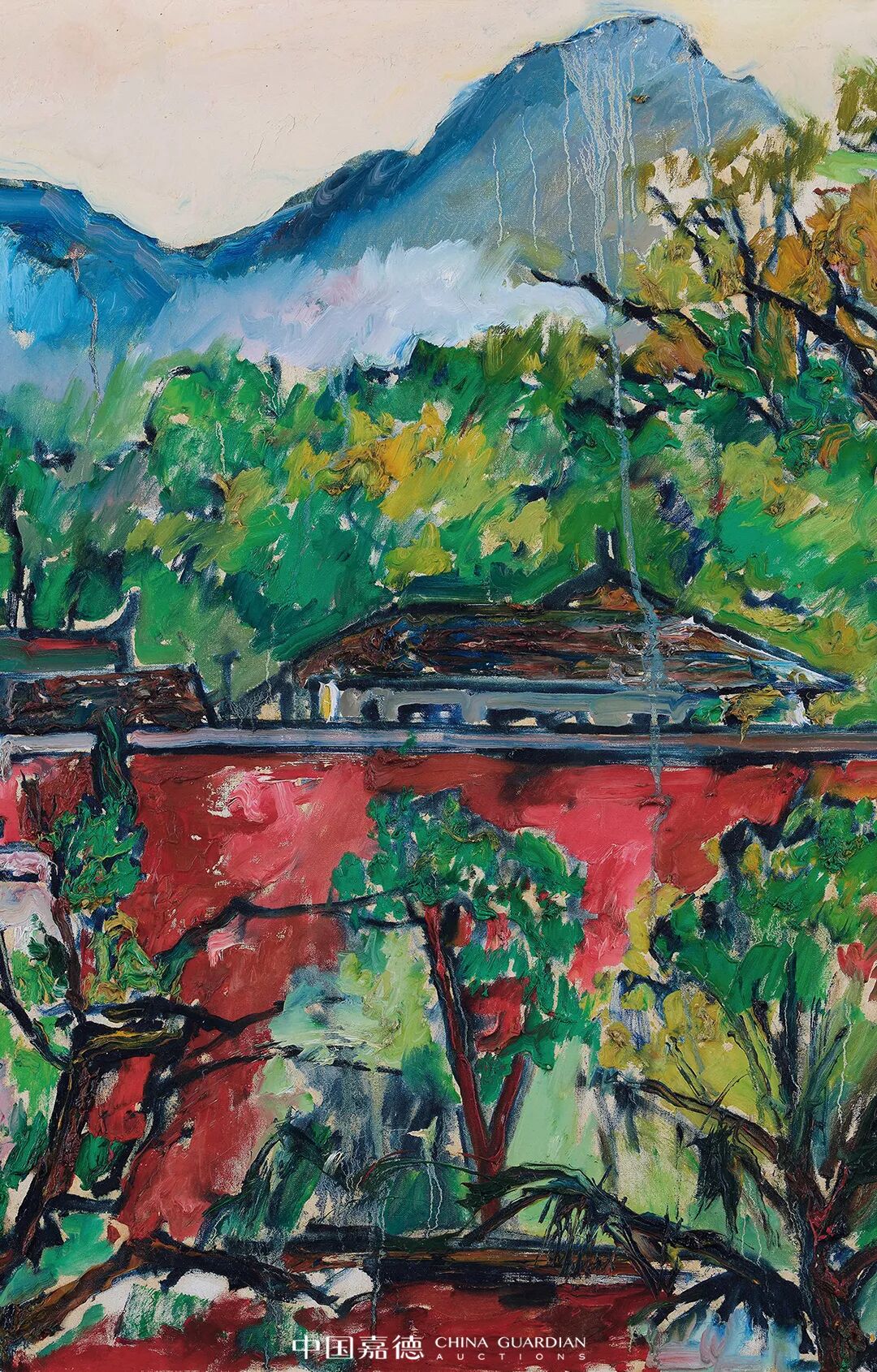 再仔细看,又没有那么简单。就说红,一般中国画家所接受的训练和最熟悉的材料就是朱砂,但这幅画中的红墙有更复杂的元素,大量使用了茜草红和镉红,以及亮部的粉红,这和他的武器库有关——1980年代颜料最讲究的老画家只有两位:刘海粟和吴大羽;也和他对色彩的理解有关。再比如“蓝山”,画得很讲究,颜色挤到调色板上之后,迅速搅一下,飞快挑到画布上,在画布上揉动,形成丰富的肌理,“蓝山”主体是群青、紫灰和少量的品红,局部又用了很多钴蓝和蓝灰色,在和绿荫交界的地方,用锌白降低饱和度——这是从早年沿用下来的用色习惯。更有意思的是右边山头那些因重力的作用而自然流淌的痕迹,如一溪流水,从高处潺潺而下,洒落于红墙之上。哪怕是只观察白色覆盖的天空,白之下做了多层色底,笔踪与刮痕互现,寓巧于拙,暗处见功夫。