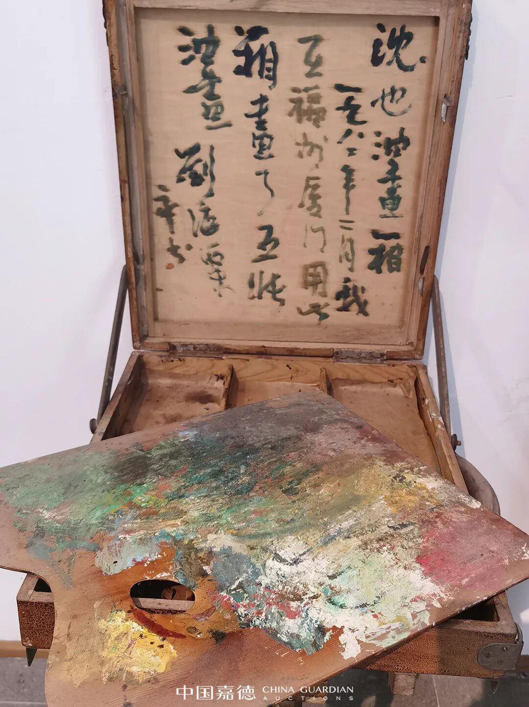 刘海粟1982年在福州厦门作画使用的油画箱和调色板。木板上的题字内容为:“沈也油画箱,一九八二年二月我在福州厦门用此箱画了五幅油画,刘海粟率书。”实物图片致谢沈也先生。
