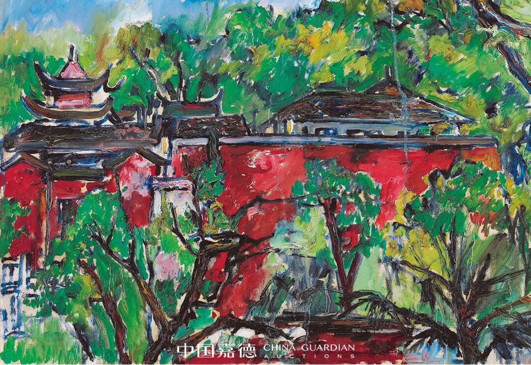 1月21号这天,快过年了,游人稀少,天气晴好,于是浩浩荡荡的七八个人,便簇拥着海老,往鼓山涌泉寺去了。对于选地方,海老很有经验,他没有进山门,也没有选景点,景点去的人多,一画就俗。他选择在山门外的石板甬道上支开画架,近处是郁郁苍苍的绿树掩映红墙,远处是涌泉寺的佛阁流丹,错落有致。鼓山涌泉寺号称“进山不见寺,进寺不见山。”前一句说庙藏在山林之中,后一句说庙中屋宇高敞,别有天地。这很像刘海粟年轻时常游常画的杭州灵隐天竺一带景致,故而他马上就捕捉到了一种既熟悉又陌生的刺激感。
