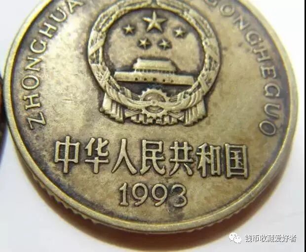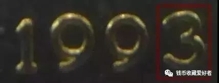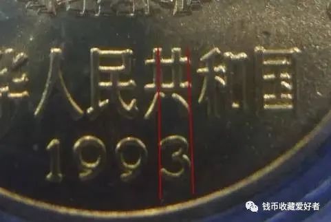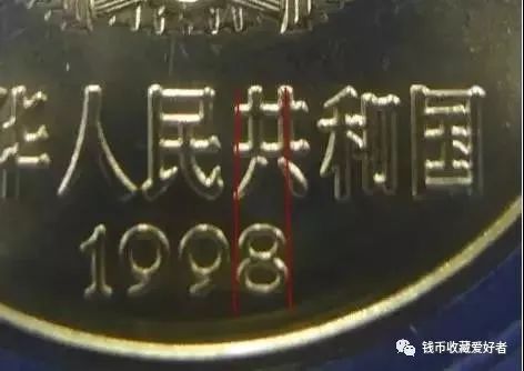 2、字体不同:1993年的字体为宋体,1998年的为仿宋体。尤其是数字1,1993年数字“1”更圆,1998年的“1”字顶端有尖尖角,像面小旗。字体的粗细不同,1993为手工雕刻模具,1998为电脑精雕模具,因此1998年的字体更细一些。