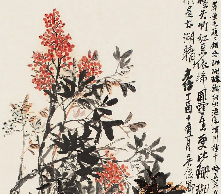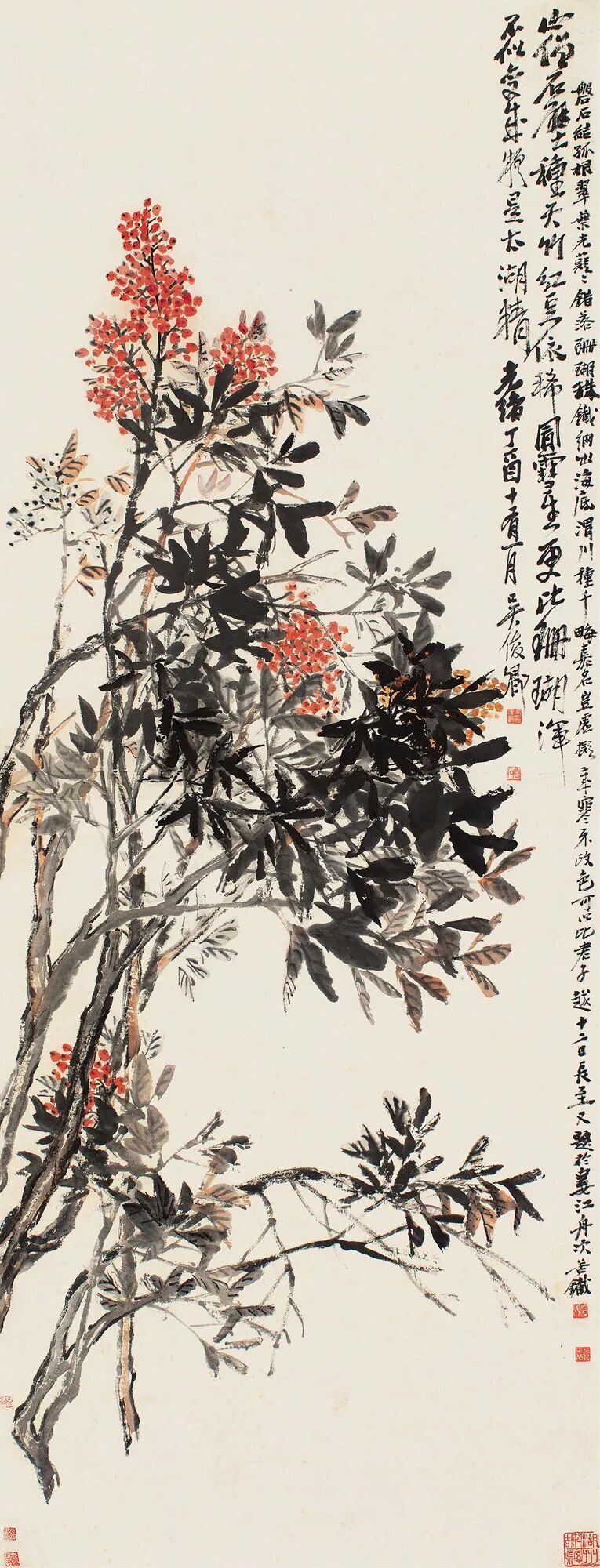 此幅《天竹图》属吴昌硕的早期作品,天竹的枝干和叶子苍润烂漫,层次丰富,色墨交融。吴昌硕在用色上似赵之谦,喜用浓丽对比的颜色,尤善用西洋红,色泽强烈鲜艳。此作品中大部分的天竹籽正是采用此颜料,深红古厚,不露火气,艳而不俗,洋溢着富丽、热烈,而又稳重典雅的趣味。浓淡兼施的绿叶,则更衬托出天竹果的莹润欲滴。天竹常年持青,嫣红的果实晶莹剔透,缀满枝头,寓意多子多孙,人丁兴旺。