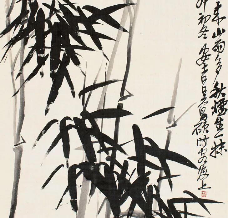 此幅《墨竹》乃缶老的成熟期作品。林风摇曳,竹叶疏密相间,富有变化,落笔潇洒自如,气宇不凡。在处理竹叶时,吴昌硕抛除了人字、分字、介字等形态的禁锢,多以“X”状交叉墨叶,整体分布上从上及下,一派水银泻地之势。尤其用淡墨画竹杆,而用浓墨画竹叶,其精心营造出的自然律动、抑扬顿挫的美感跃然纸上,使整个画面充满了生气与灵动之感。
