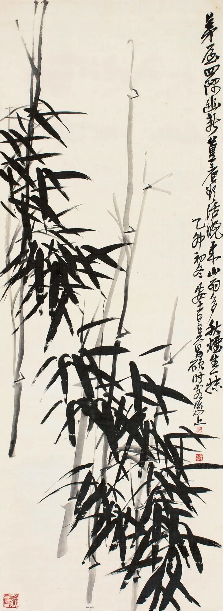 题识:茅屋四隅幽,新篁看欲活,晓来山雨多,秋烟生一抹。乙卯初冬,安吉吴昌硕时客海上。