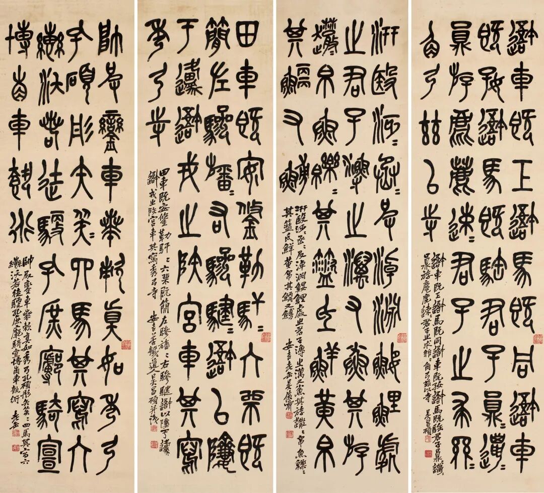 3.田车既安,鋚勒馯馯。六□既简,左骖旛旛,右骖。吾以跻于原,吾戎止聅。宫车其写,秀工寺。安吉苦铁道人吴昌硕并识。