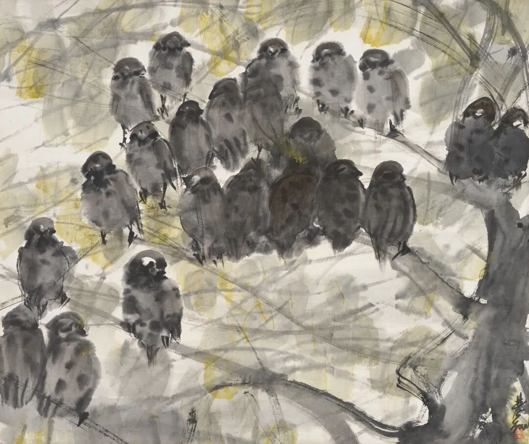 即便是常绘的禽鸟题材,林风眠在《合鸣》中也加入了与众不同的巧思。在未及四平尺的画面上,画家描绘出22只麻雀,它们随意栖息于树枝上,有凝神者,有倾听者,有背身眯眼者,有跃跃欲试者,有两两倚偎者,也有怡然自适者......酣畅淋漓的水墨挥洒出大片鹅黄色树影,为画面增添了无限温柔与浪漫。