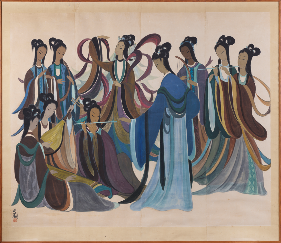 林风眠在长1.6米、高1.3米的巨幅之上绘制了十位飘逸传神的敦煌女子乐人,她们分持各式乐器,或演奏或纵情舞蹈,裙带翻飘,仿若神女,面容延续了其仕女画的典型特征,属公私收藏中人物最为众多、目前释出市场最为硕大的一幅。艺术家在作品的敷色方面也别具巧思,其曾在两线之间的平涂与中间色的度数的掌握中反复探索与尝试,最终呈现出完整的画面效果。