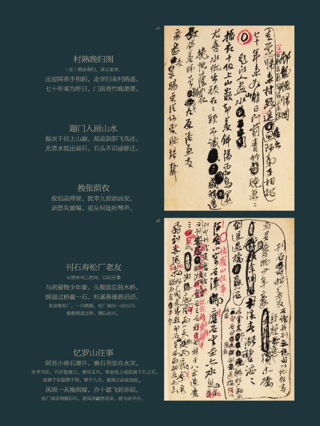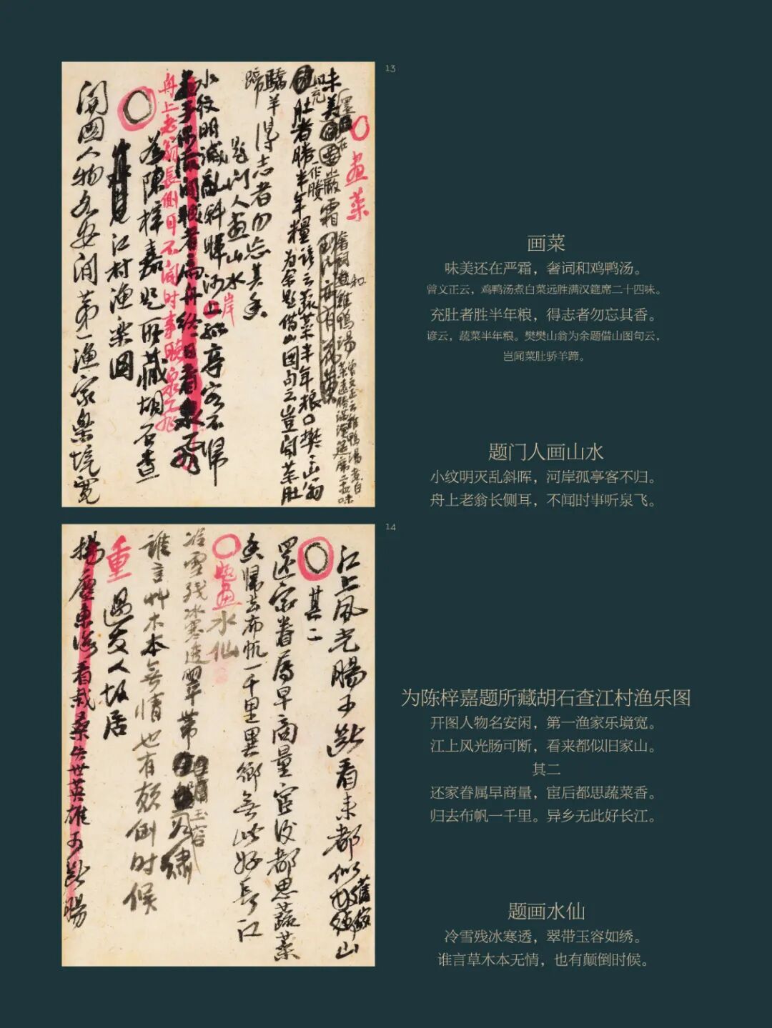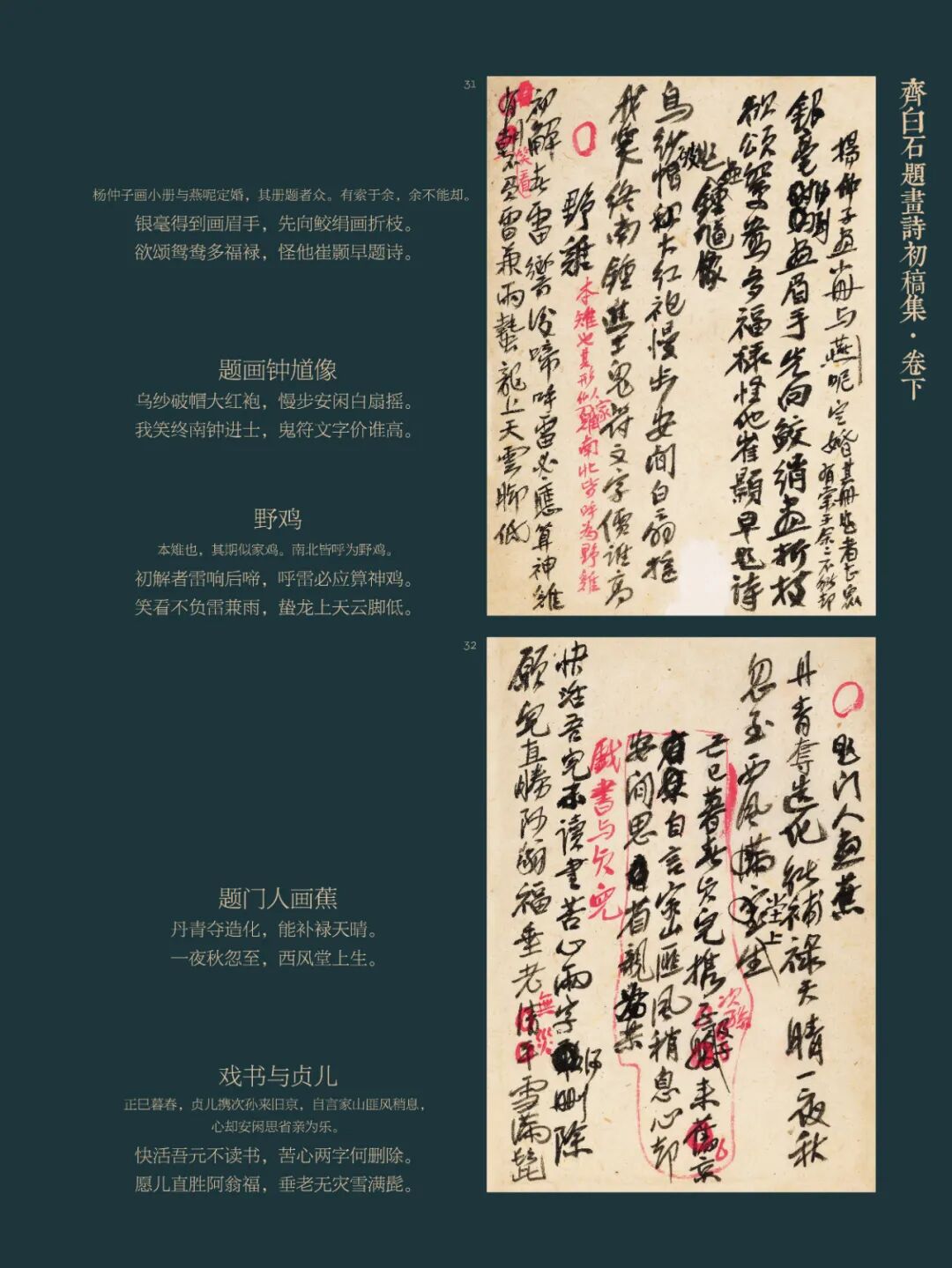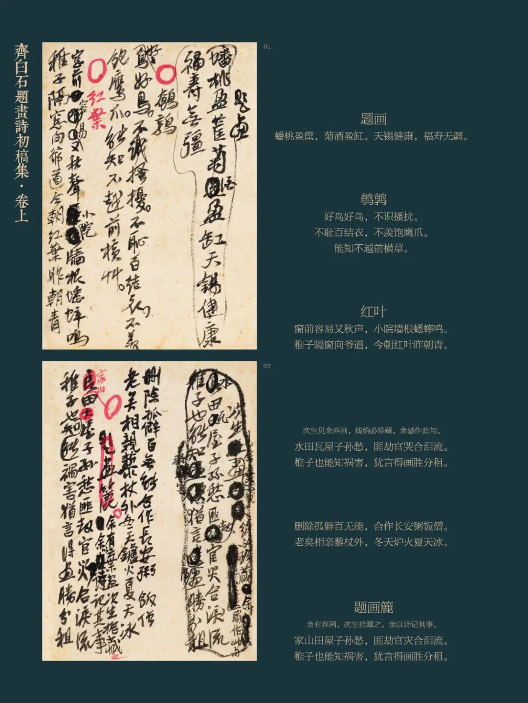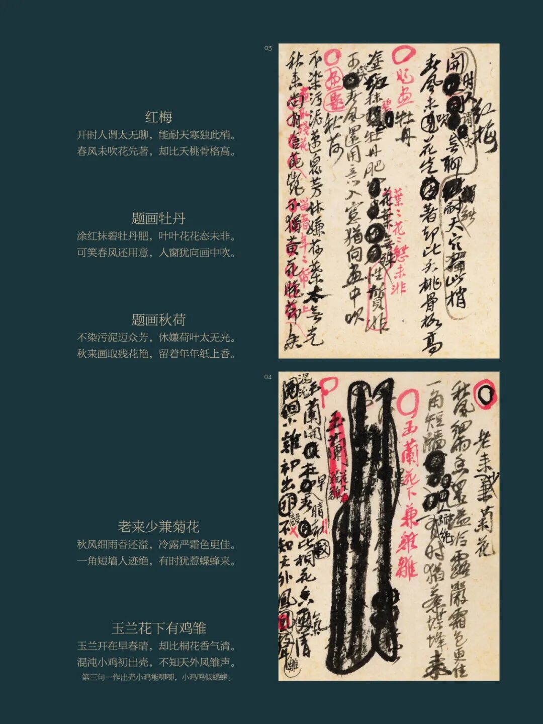 将《题画诗册》与《白石诗草》北京画院本两相比对可见,北京画院本多为人与事的客观描述。《题画诗》本则保留了更多具体物象的吟咏。《题画诗》中的多处批红和圈点,也还原出白石老人在作诗过程中反复推敲和斟酌的心理活动,一个艺术家臻于完善的创作过程历历在目。正是在这吟咏之中,“诗人齐白石”的意像具体了起来,他的思想、情怀、世界观、艺术观也丰富了起来。对比廖廖几首两个稿本中相同题材的描述,发现《题画诗》本诗意犹胜,因而或可就此推测,《题画诗》更像是用于自珍的密笈。