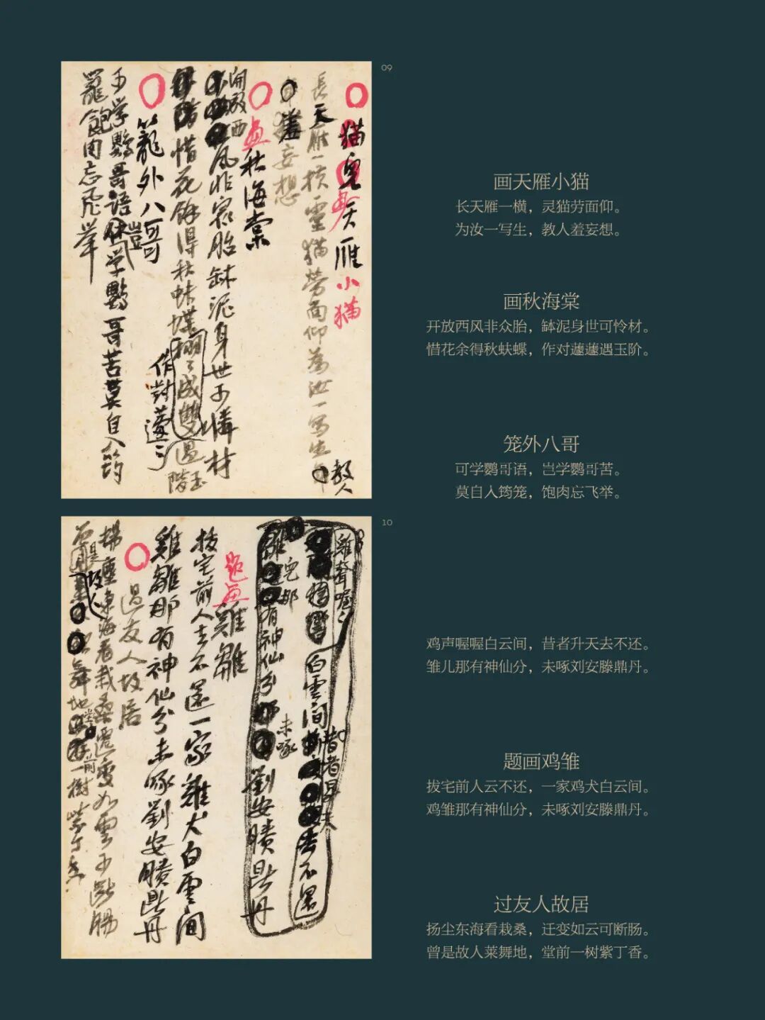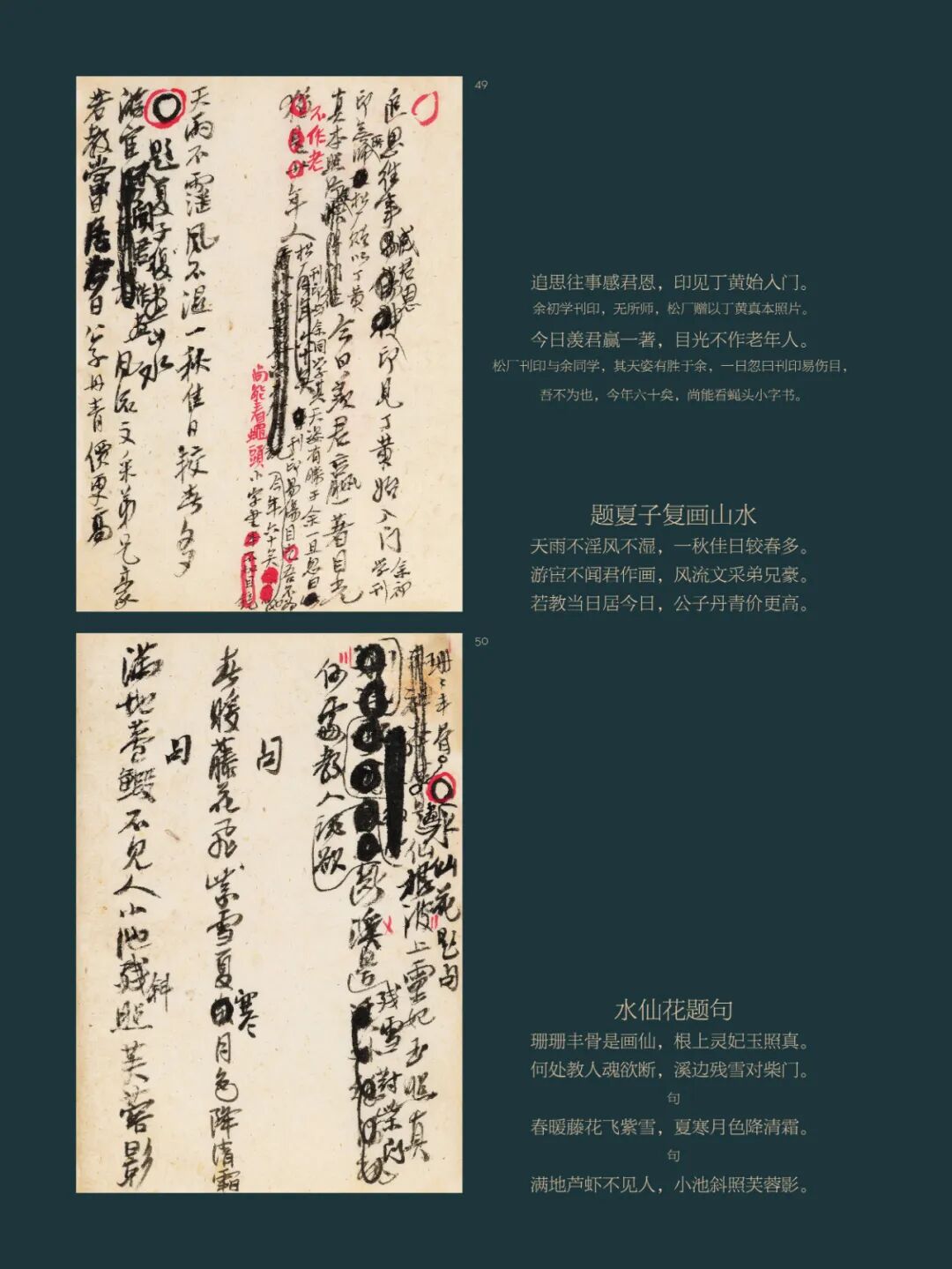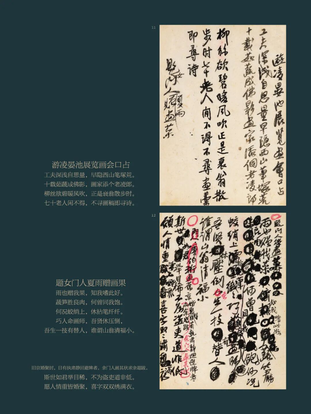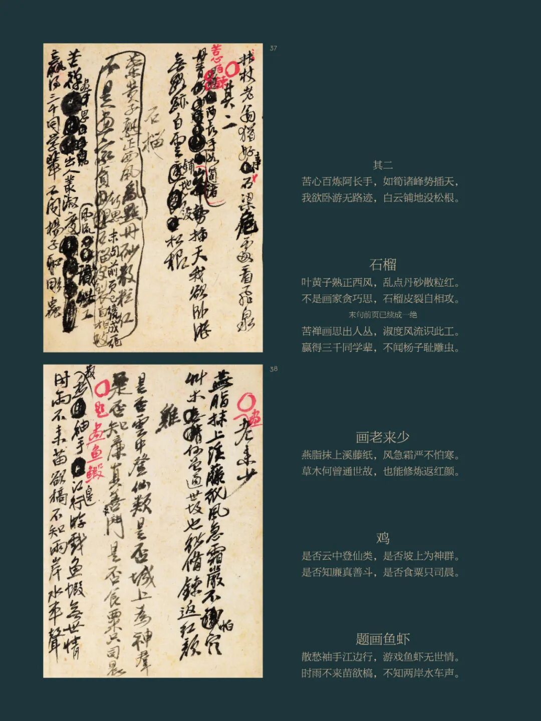 是册内容丰富,多数为白石自题画作之诗,行文不拘常格,文字活泼生动,风格幽默犀利。如题《小鸡食水图》说:“小鸡出壳在草姿,春晴口喝雨来迟。一朝与犬登云去,莫忘泥盆食水时。”言辞幽默,行文自由,亦有富贵勿忘贫贱时的人生哲思。诸多题画诗中,篇幅或长或短,七言、六言、五言、四言皆有。有时是警句妙词,如“宁肯为盗,不肯伤廉”;有时是野语村言,如“好鸟好鸟,不识骚扰。不耻百结衣,不羡鹰爪饱”;有时是吉祥祝福,如“挂君高堂上,日日生春风”;有时是心得体会,如“诗者睡之余,画者工之余,活者寿,劫之余”;有时是抒发心绪,如“文章废却国无魂,满地江湖见汝群”。这些诗文的字里行间,处处洋溢着浓厚的感情色彩和盎然的生活情趣,在内容的深度和广度上均有超越古人之处,也为今人所难以企及。除题自画之外,是册亦有白石题他人之作,如题“女门人夏雨赠画稿”、题他人“三闾大夫画像”、题“孙宋若画册”、题“门人张万里落花飞蝶册”、题“张次溪江堂待学图”等等。这些题画诗是研究齐白石及其门人构成、传派的重要文献,价值不可忽视。最后要说的是本册中的诗文亦涉及到白石老人于彼时艺坛时人的相处过往。如“作画寄徐悲鸿题二绝句”中记述了徐悲鸿聘请齐白石“三过借山馆”的来龙去脉,题门人王妙如画时言讲为其代订润格之事,“忆罗山往事”中回忆了自己学印始末,林林总总,不一而足。这是研究齐白石生平交游的重要史料,细读细观,必有收获。最后,是册洋洋洒洒数以千言,行笔顺畅自然,笔走龙蛇间圆转如意,老辣尽显。而遇诗思不畅、行文雍塞不如意时,便不假思索圈点更改,这是白石老人斟酌推敲之故,情绪流露,才情湛然。读之如晤白石,叫人不忍释卷。![]()