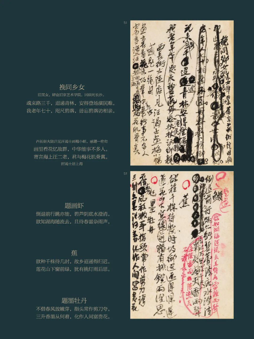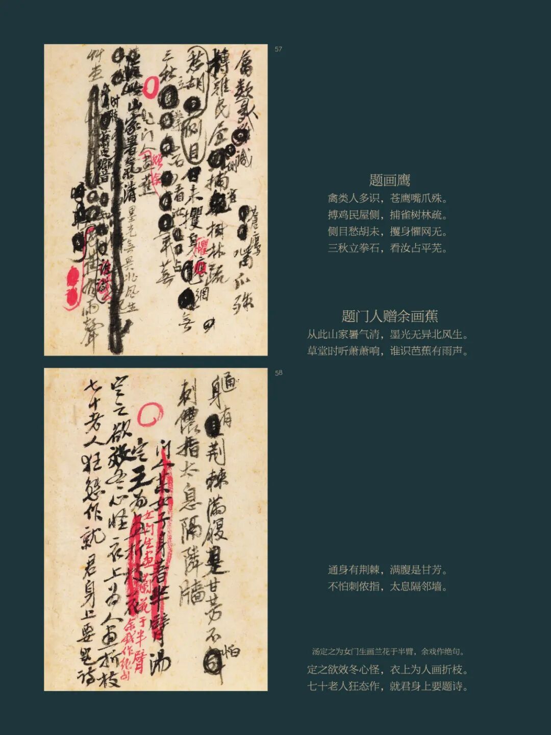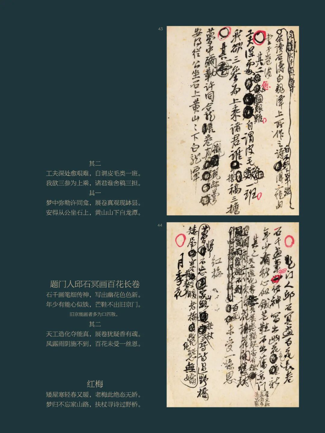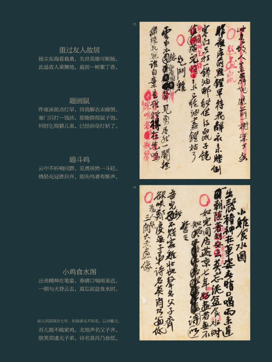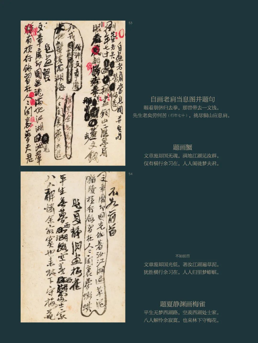 是册内容丰富,多数为白石自题画作之诗,行文不拘常格,文字活泼生动,风格幽默犀利。如题《小鸡食水图》说:“小鸡出壳在草姿,春晴口喝雨来迟。一朝与犬登云去,莫忘泥盆食水时。”言辞幽默,行文自由,亦有富贵勿忘贫贱时的人生哲思。诸多题画诗中,篇幅或长或短,七言、六言、五言、四言皆有。有时是警句妙词,如“宁肯为盗,不肯伤廉”;有时是野语村言,如“好鸟好鸟,不识骚扰。不耻百结衣,不羡鹰爪饱”;有时是吉祥祝福,如“挂君高堂上,日日生春风”;有时是心得体会,如“诗者睡之余,画者工之余,活者寿,劫之余”;有时是抒发心绪,如“文章废却国无魂,满地江湖见汝群”。这些诗文的字里行间,处处洋溢着浓厚的感情色彩和盎然的生活情趣,在内容的深度和广度上均有超越古人之处,也为今人所难以企及。除题自画之外,是册亦有白石题他人之作,如题“女门人夏雨赠画稿”、题他人“三闾大夫画像”、题“孙宋若画册”、题“门人张万里落花飞蝶册”、题“张次溪江堂待学图”等等。这些题画诗是研究齐白石及其门人构成、传派的重要文献,价值不可忽视。最后要说的是本册中的诗文亦涉及到白石老人于彼时艺坛时人的相处过往。如“作画寄徐悲鸿题二绝句”中记述了徐悲鸿聘请齐白石“三过借山馆”的来龙去脉,题门人王妙如画时言讲为其代订润格之事,“忆罗山往事”中回忆了自己学印始末,林林总总,不一而足。这是研究齐白石生平交游的重要史料,细读细观,必有收获。最后,是册洋洋洒洒数以千言,行笔顺畅自然,笔走龙蛇间圆转如意,老辣尽显。而遇诗思不畅、行文雍塞不如意时,便不假思索圈点更改,这是白石老人斟酌推敲之故,情绪流露,才情湛然。读之如晤白石,叫人不忍释卷。![]()