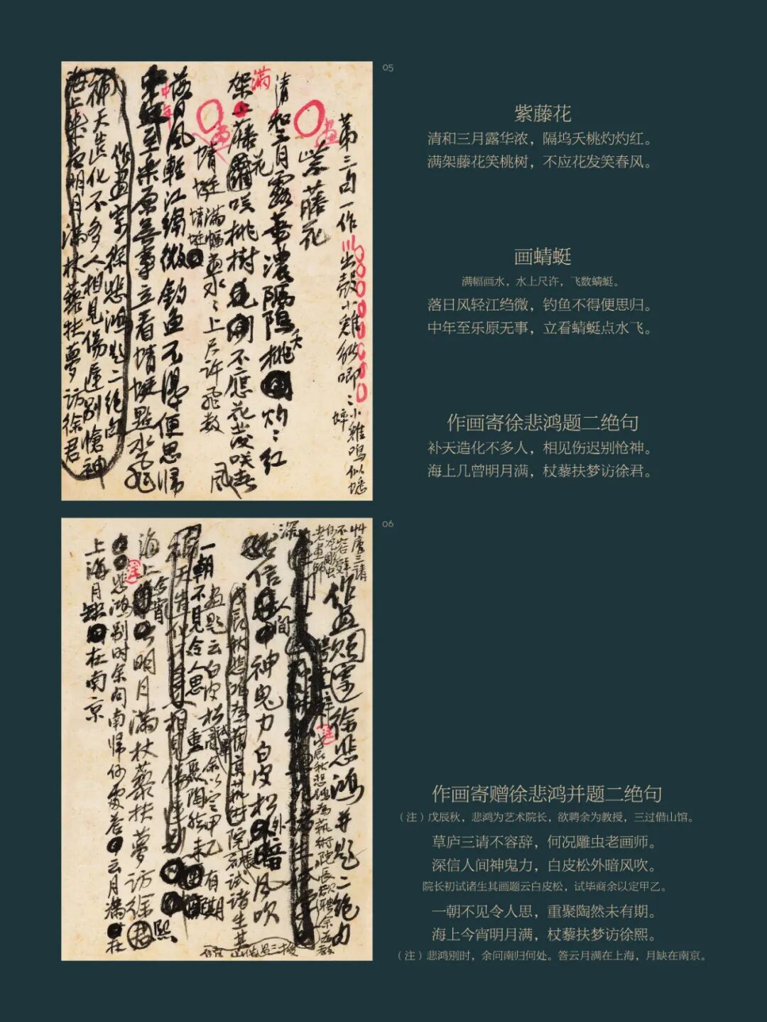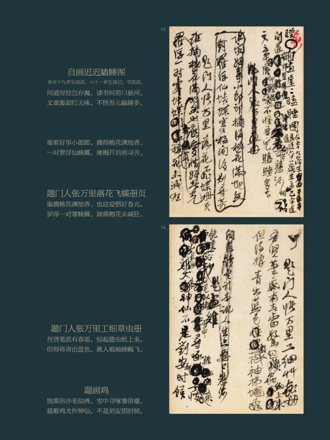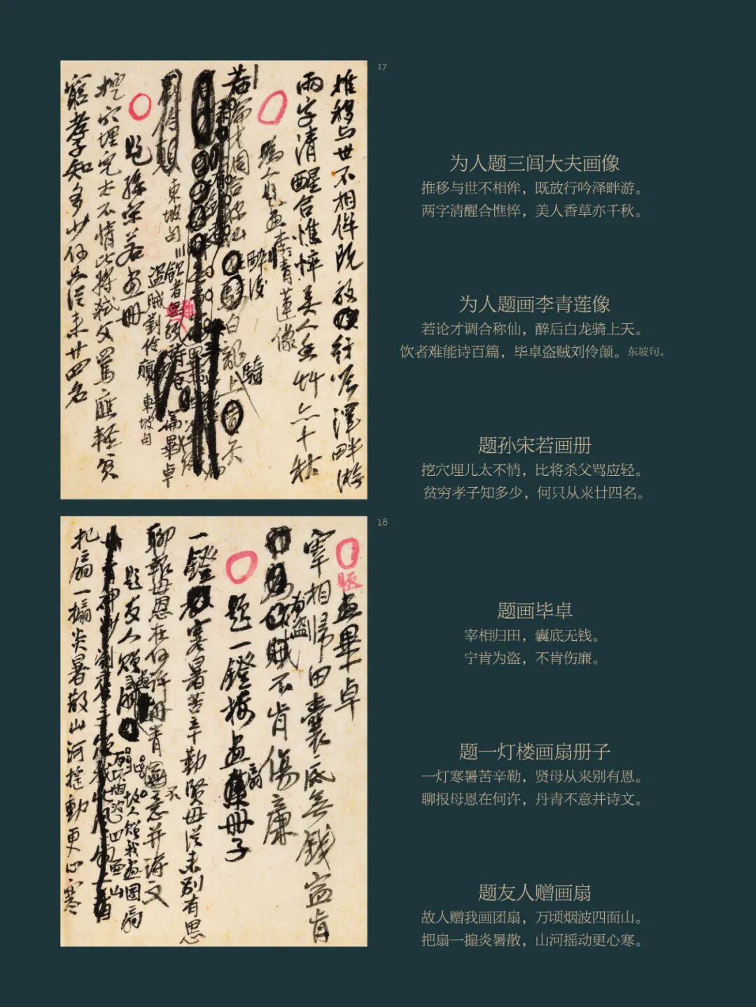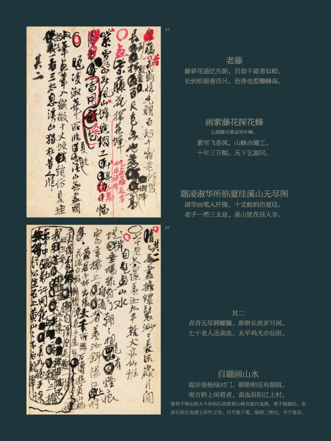 是册内容丰富,多数为白石自题画作之诗,行文不拘常格,文字活泼生动,风格幽默犀利。如题《小鸡食水图》说:“小鸡出壳在草姿,春晴口喝雨来迟。一朝与犬登云去,莫忘泥盆食水时。”言辞幽默,行文自由,亦有富贵勿忘贫贱时的人生哲思。诸多题画诗中,篇幅或长或短,七言、六言、五言、四言皆有。有时是警句妙词,如“宁肯为盗,不肯伤廉”;有时是野语村言,如“好鸟好鸟,不识骚扰。不耻百结衣,不羡鹰爪饱”;有时是吉祥祝福,如“挂君高堂上,日日生春风”;有时是心得体会,如“诗者睡之余,画者工之余,活者寿,劫之余”;有时是抒发心绪,如“文章废却国无魂,满地江湖见汝群”。这些诗文的字里行间,处处洋溢着浓厚的感情色彩和盎然的生活情趣,在内容的深度和广度上均有超越古人之处,也为今人所难以企及。除题自画之外,是册亦有白石题他人之作,如题“女门人夏雨赠画稿”、题他人“三闾大夫画像”、题“孙宋若画册”、题“门人张万里落花飞蝶册”、题“张次溪江堂待学图”等等。这些题画诗是研究齐白石及其门人构成、传派的重要文献,价值不可忽视。最后要说的是本册中的诗文亦涉及到白石老人于彼时艺坛时人的相处过往。如“作画寄徐悲鸿题二绝句”中记述了徐悲鸿聘请齐白石“三过借山馆”的来龙去脉,题门人王妙如画时言讲为其代订润格之事,“忆罗山往事”中回忆了自己学印始末,林林总总,不一而足。这是研究齐白石生平交游的重要史料,细读细观,必有收获。最后,是册洋洋洒洒数以千言,行笔顺畅自然,笔走龙蛇间圆转如意,老辣尽显。而遇诗思不畅、行文雍塞不如意时,便不假思索圈点更改,这是白石老人斟酌推敲之故,情绪流露,才情湛然。读之如晤白石,叫人不忍释卷。![]()