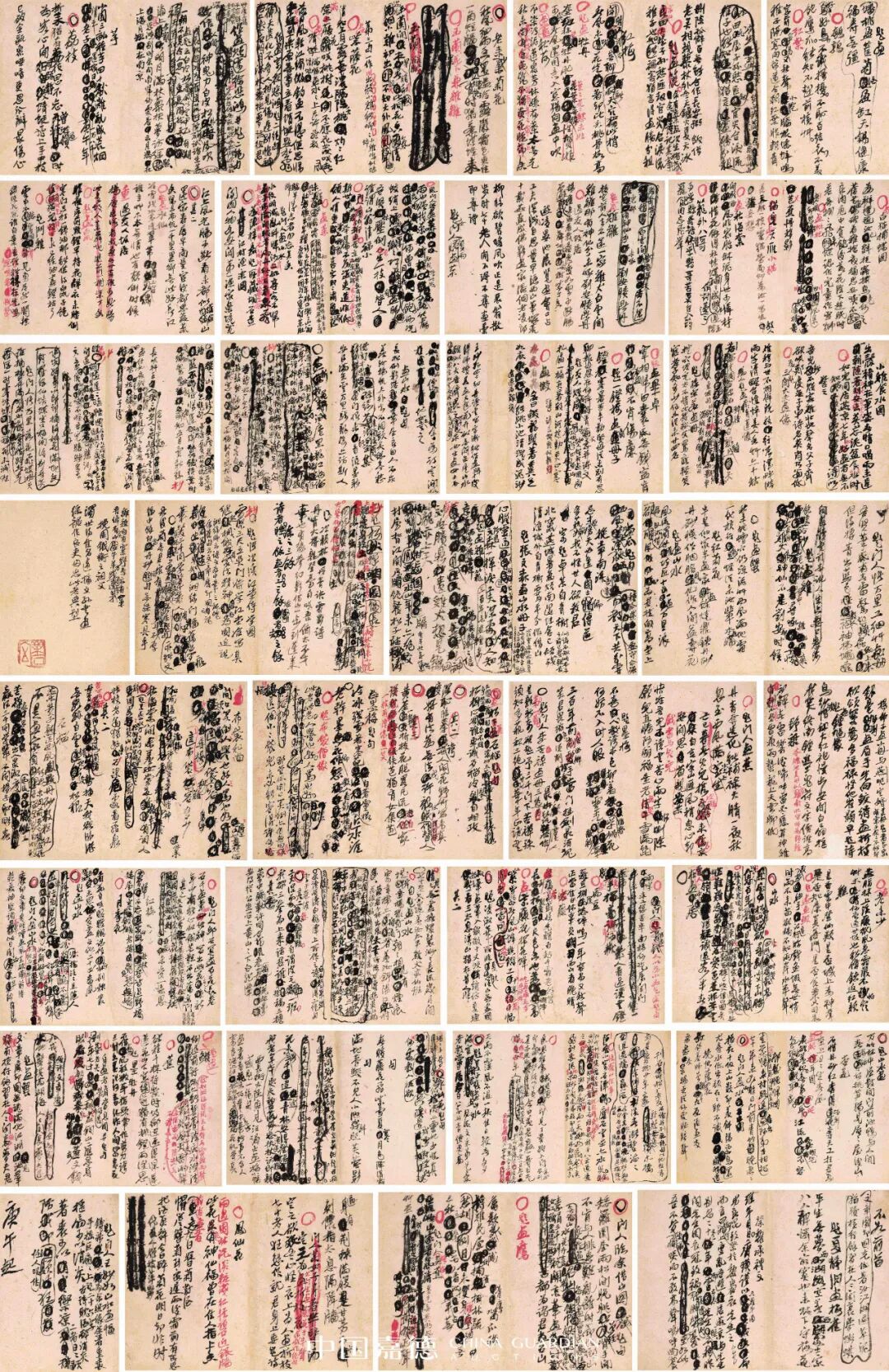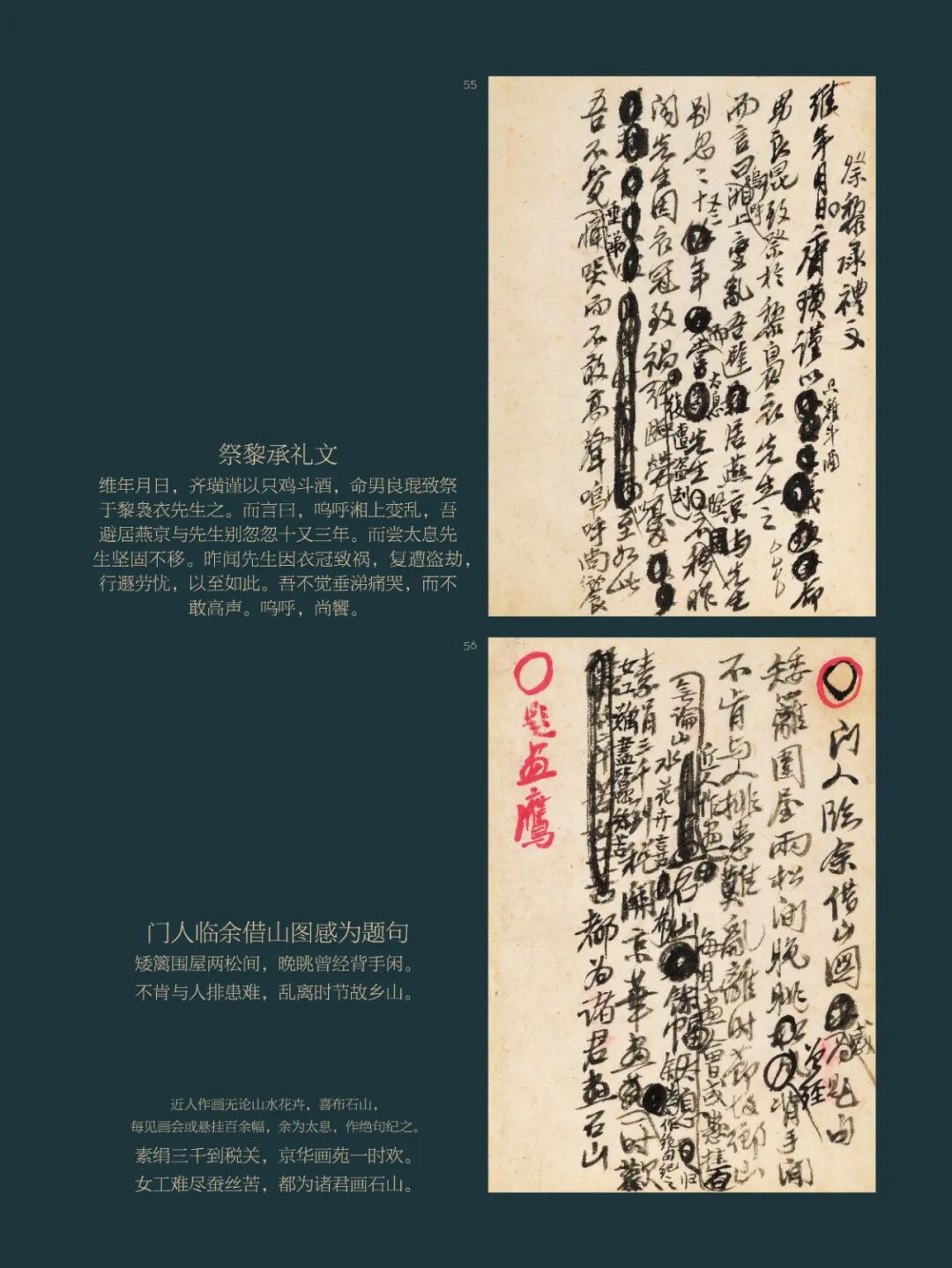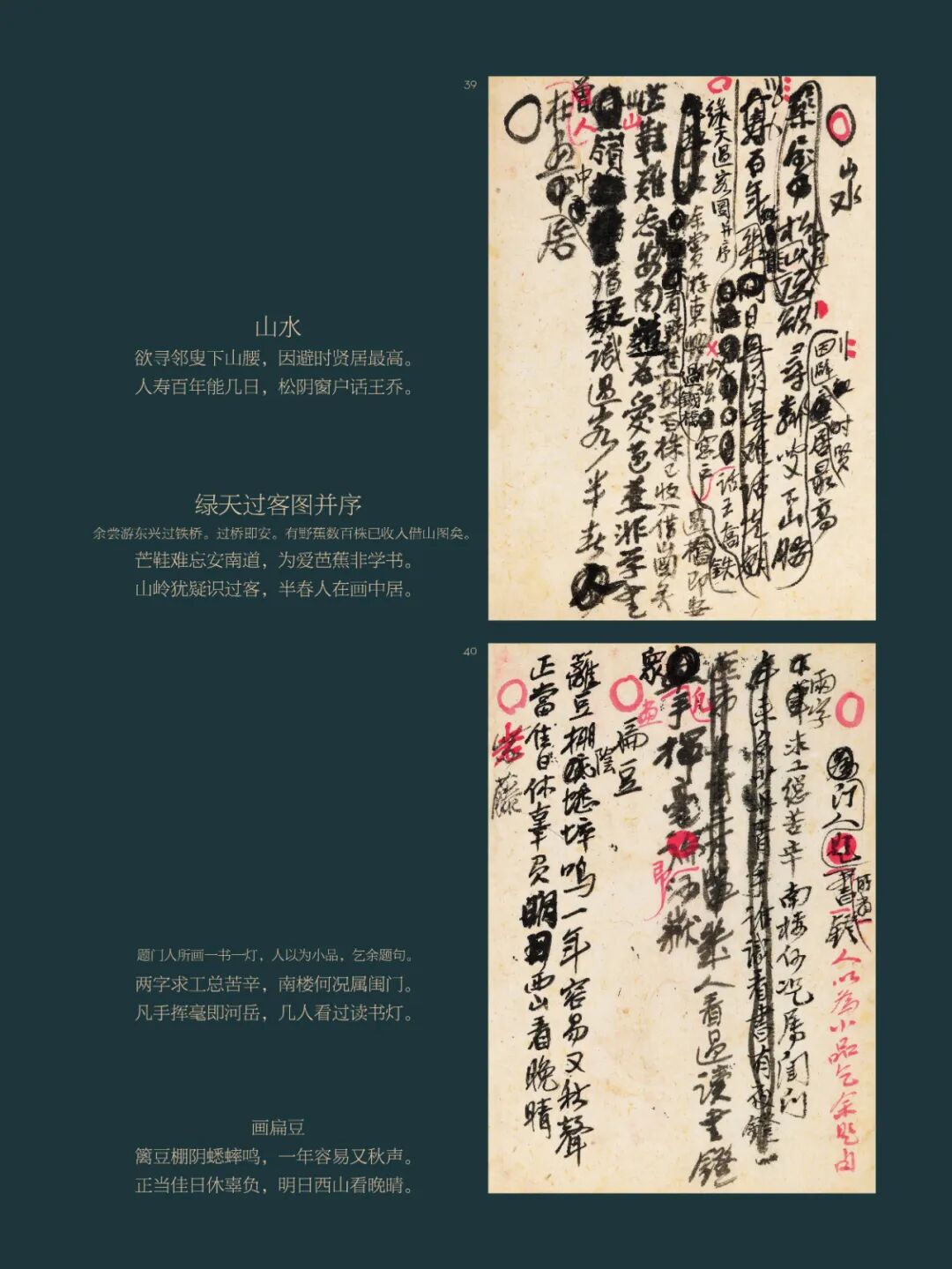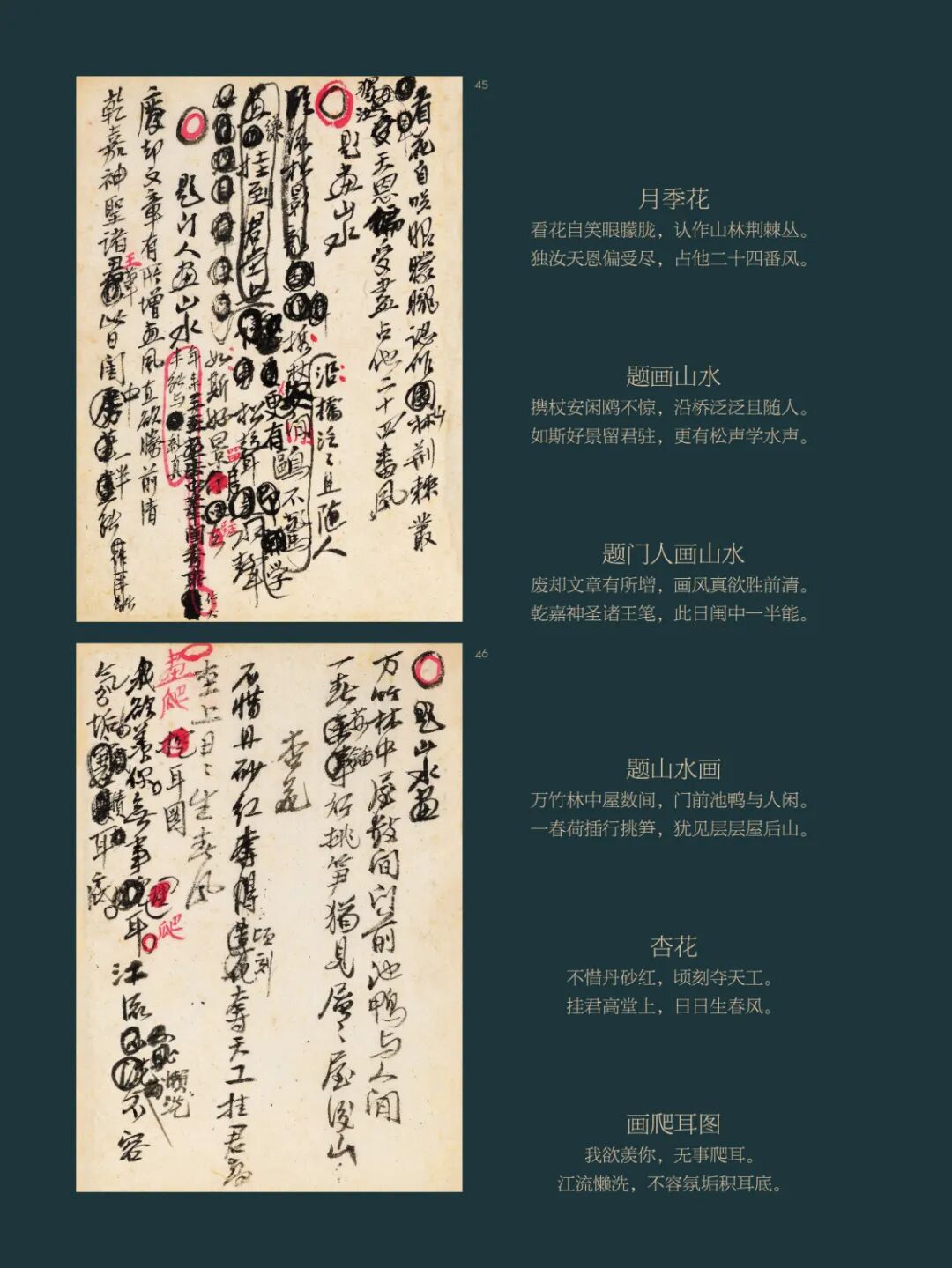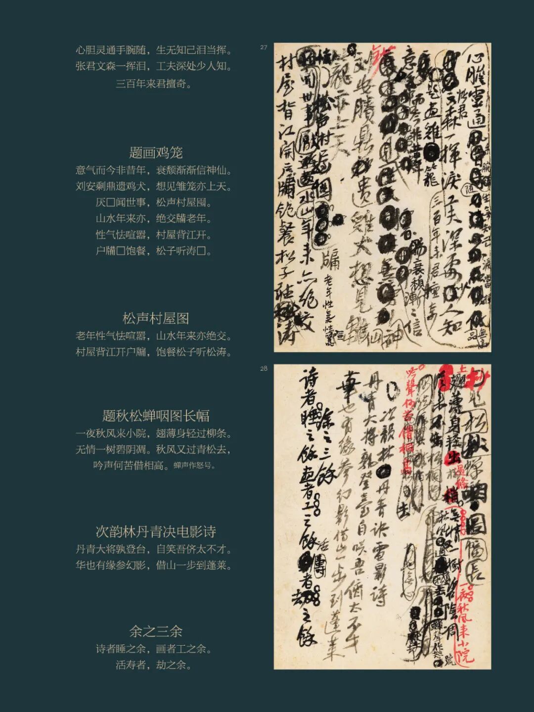 是册内容丰富,多数为白石自题画作之诗,行文不拘常格,文字活泼生动,风格幽默犀利。如题《小鸡食水图》说:“小鸡出壳在草姿,春晴口喝雨来迟。一朝与犬登云去,莫忘泥盆食水时。”言辞幽默,行文自由,亦有富贵勿忘贫贱时的人生哲思。诸多题画诗中,篇幅或长或短,七言、六言、五言、四言皆有。有时是警句妙词,如“宁肯为盗,不肯伤廉”;有时是野语村言,如“好鸟好鸟,不识骚扰。不耻百结衣,不羡鹰爪饱”;有时是吉祥祝福,如“挂君高堂上,日日生春风”;有时是心得体会,如“诗者睡之余,画者工之余,活者寿,劫之余”;有时是抒发心绪,如“文章废却国无魂,满地江湖见汝群”。这些诗文的字里行间,处处洋溢着浓厚的感情色彩和盎然的生活情趣,在内容的深度和广度上均有超越古人之处,也为今人所难以企及。除题自画之外,是册亦有白石题他人之作,如题“女门人夏雨赠画稿”、题他人“三闾大夫画像”、题“孙宋若画册”、题“门人张万里落花飞蝶册”、题“张次溪江堂待学图”等等。这些题画诗是研究齐白石及其门人构成、传派的重要文献,价值不可忽视。最后要说的是本册中的诗文亦涉及到白石老人于彼时艺坛时人的相处过往。如“作画寄徐悲鸿题二绝句”中记述了徐悲鸿聘请齐白石“三过借山馆”的来龙去脉,题门人王妙如画时言讲为其代订润格之事,“忆罗山往事”中回忆了自己学印始末,林林总总,不一而足。这是研究齐白石生平交游的重要史料,细读细观,必有收获。最后,是册洋洋洒洒数以千言,行笔顺畅自然,笔走龙蛇间圆转如意,老辣尽显。而遇诗思不畅、行文雍塞不如意时,便不假思索圈点更改,这是白石老人斟酌推敲之故,情绪流露,才情湛然。读之如晤白石,叫人不忍释卷。![]()