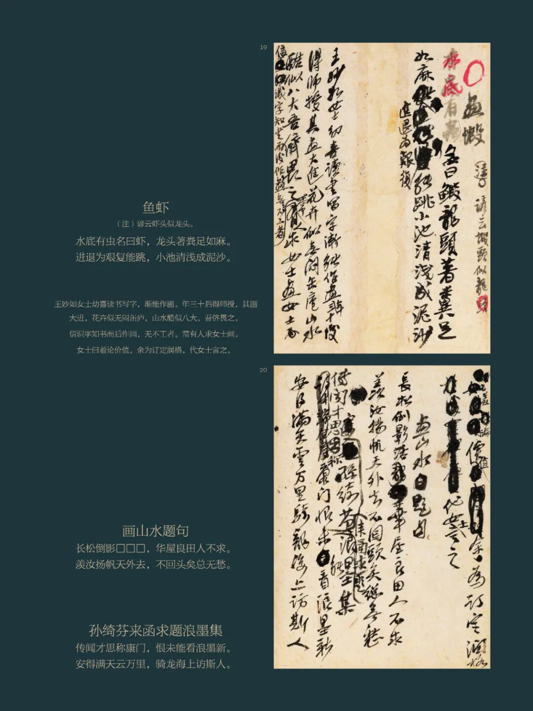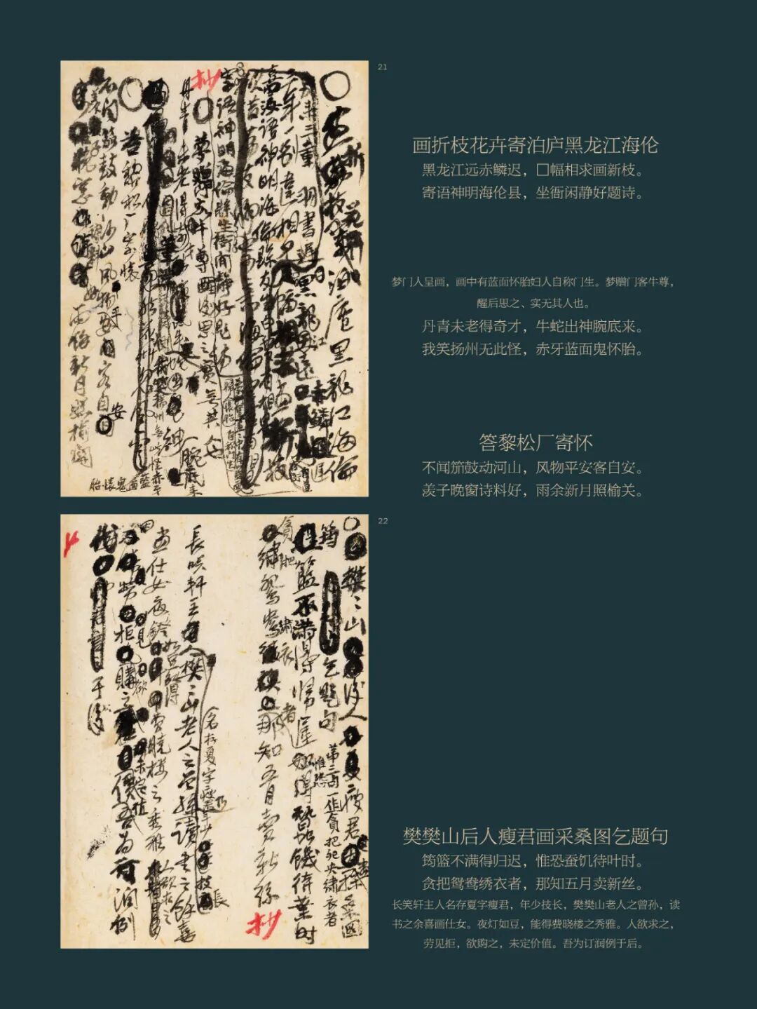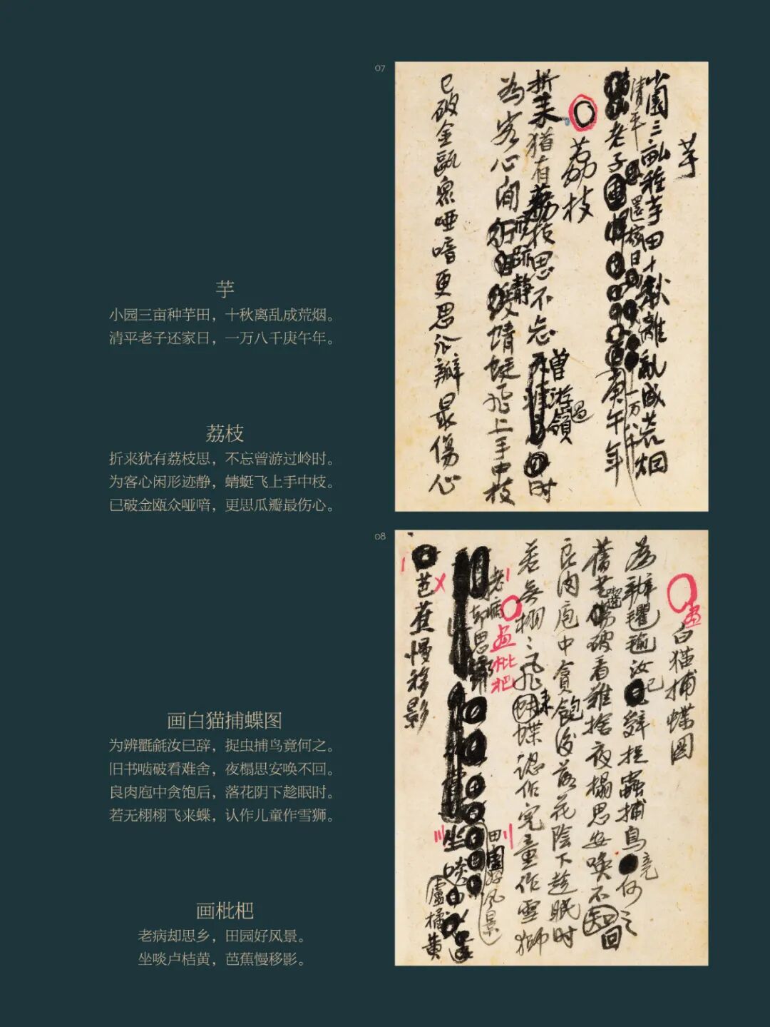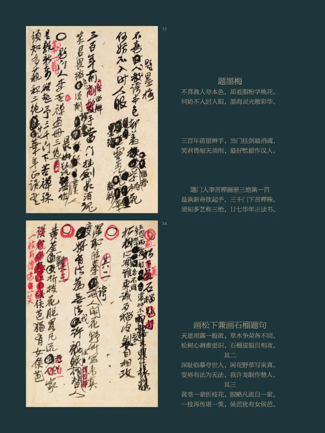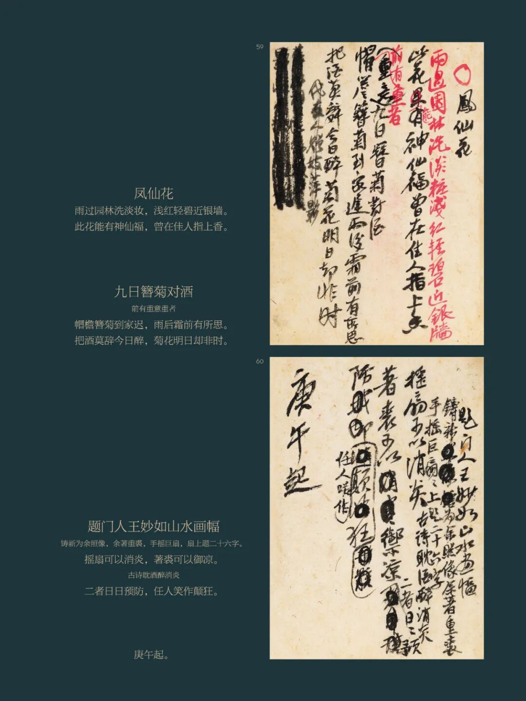 《人生若寄·北京画院藏齐白石手稿(诗稿)》影印出版了部分馆藏《白石诗稿》,甲子(1924年)至壬申(1932年),而这些只是《白石诗草》的部分内容。以“丙寅至辛未(1926-1931年)”、“庚午至壬申(1930-1932年)”所见,收录的词稿与本件《题画诗册》(庚午前)并无重叠,可谓是对北京画院馆藏本的重要补白。![]()