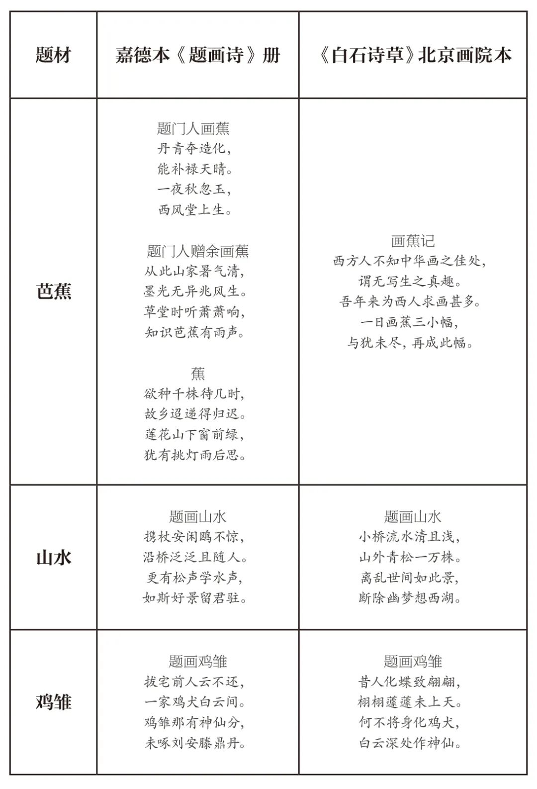 嘉德本《题画诗》册与北京画院本《白石诗草》同题材诗文对比