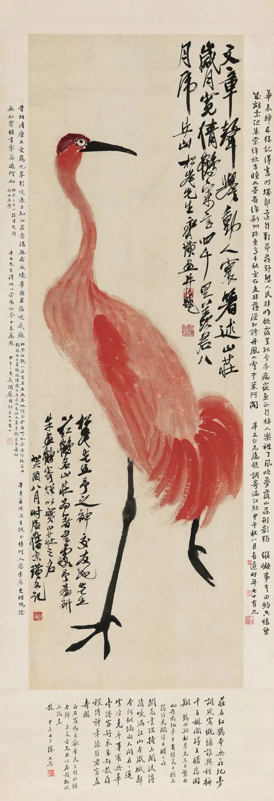 齐白石被誉为“诗人画家”,他的诗,朴素直白,直抒胸臆,不追求辞藻的华丽,强调性灵的抒发。这离不开他的伯乐张次溪的四面网罗、八方推动,一力促成1933年《白石诗草》的印制,齐白石终于有自信能向世人证明“齐璜能诗”,且“我诗第一,印第二,字第三,画第四。”生动地写照出他二、三十年代安定的生活与心境,对人生境遇的认知与感慨。题画诗表达了他的思想、情怀、世界观、艺术观,也使他的绘画达到 了更高境界……文人画的高度。从东莞迁居北京的张篁溪、张次溪父子与齐白石打了四十多年的交道,是齐白石在北京的密友和坚定的支持者。1931与1933年夏天,齐白石曾两次入住位于城东南的张园,“我在张园住的时候,不但袁督师的遗迹,都已瞻仰过了,就连附近万柳堂、夕照寺、卧佛寺等许多名胜,也都游览无遗。”三十年代初的张次溪,发文章,交师友,少年得意,头角峥嵘。而此时的齐白石七十初度,年近“古稀”,精气神却恰如壮年。张家父子力主老人将丁巳(1917年)以后诗稿结集出版,以展现他在诗词上非凡的造诣。白石老人怀着自谦而忐忑的心情,在张次溪的一再推挽之下,认真对诗稿作了反复推敲,手稿本将这一心理活动完全的原貌保存了下来。张次溪先是排比出定稿来,然后落实排字、校改、印刷、装订,将今日“责任编辑”与“责任印制”的担子一肩承担起来。而齐白石则极为上心,绝不草率。“以多刻多画报之”。1933年,《白石诗草》面世,白石老人题下:“画名惭愧扬天下,吟咏何心并世知。名谢次溪为好事,满城风雨乞题词”。元宵节刚过,八卷本仿宋字排的《白石诗草》印成。自1928年《借山吟馆诗草》付梓后,这是他的第二本诗集。这本诗集,前由白石友人樊樊山选定,又经白石老友王仲言补选,嗣后又有黎锦熙的校订,费了许多时间人力。“参与为齐白石选诗的王仲言;天津诗坛名家赵幼梅;张次溪的老师吴北江、宗子威;曾任吴佩孚秘书长的杨云史;齐白石的湘潭老友黎松庵;张氏父子的山东好友王蟫斋;著名的思玄堂主人汪荣宝;湘潭齐白石的本家齐廷襄;与梅兰芳交往密切的李释勘……”此时的白石老人在京城还尚未完全打开局面。诗集还未印出,凭着片断印象,更重要的是听任次溪父子的“一面之词”,靠人脉与旧谊,这些当时耆宿,就答应题词,使老人感到“足慰我心”。张家人许诺,条件是齐白石向每位回赠一幅画作,而且言明是老人后来这些年不轻易为之的山水画。1933年,71岁的老画家,25岁的张次溪多方沟通。《白石诗草》终于付梓,张次溪的作用及师长对他的信任,让人钦佩。今人言齐白石书画,价格动辄几百上千万。而在这次题词赠画的活动中,白石老人送出的画单在后来看来可谓惊人而极具诚意。从中可见白石对自己“诗名”的重视,“文名青史”在他心目中显然更具份量。赠吴北江《莲池书院图》,赠赵幼梅《明灯夜雨楼》,赠宗子威《辽东吟馆谈诗图》,赠杨云史《江山万里楼图》……均创作于此时。而这一年,通过张次溪的介绍,齐白石还认识了另一位文字知己,苏州吴江金松岑。白石与他通信,求他出马作传。金氏十分看重,说:像齐白石这样的人,才不辱没他的文字。因而才有了后面的《白石老人自述》。将一生经历,由张次溪笔录下来,寄给金松岑替白石作传记的资料,为白石老人作传的工程才算启动了。这些情谊在后来的市场中有了强劲的回馈。中国嘉德2016秋拍,赠吴北江《莲池书院图》以5290万元成交;2014春拍,题赠金松岑的齐白石《红鹤》以3680万元成交。参考图:为金松岑作《红鹤》 中国嘉德2014春季拍卖会 Lot1181 成交价3680万