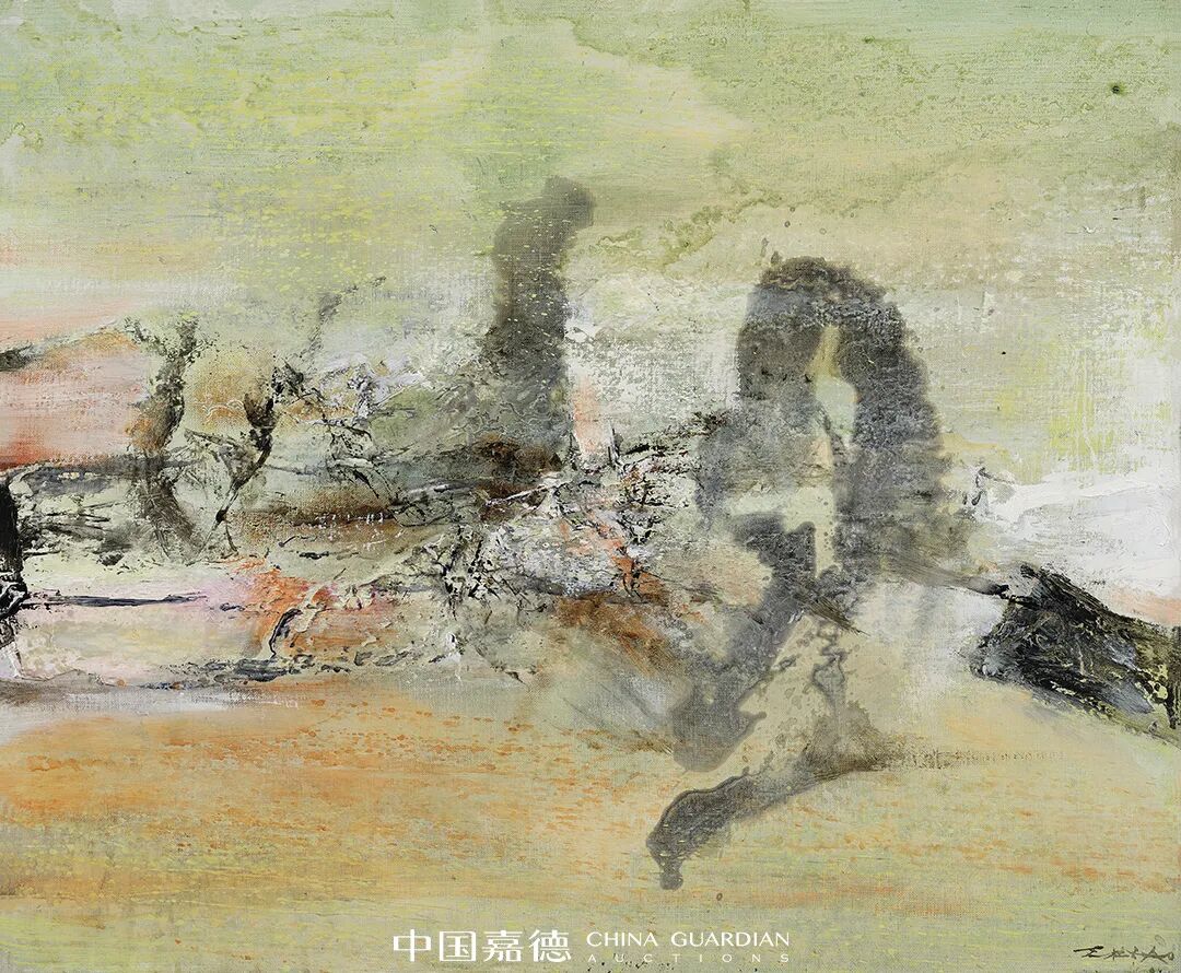 来到1990年代前后,无疑是赵无极艺术生涯广受世人肯定的巅峰时期,他不但获得高松宫殿下纪念世界文化奖等多项殊荣,并先后于北京、上海、台北及墨西哥等地举办大型回顾展;更重要的是,其画艺已臻化境,他已然在传统与创新、具象与抽象、理性与感性之间开创了一条属于他的道路。在此一时期,赵无极倾向使用轻盈浅淡的色彩,藉由去中心化、不着一处的空间布局,来打造出充满抒情美感、可观可游的山水造境,进而折射出他追求天人合一、虚静平和的宇宙观。像是此处所见之《30.11.94》一作,即运用了较为浅淡的嫩绿为底色,缀点些许橘黄之余,又以行云流水的大笔墨色线条穿越整个画面,俨然高低起伏、绵延不绝的山色具现眼前,亦能得见几分赵孟俯《鹊华秋色图》平和开阔又极具文人气韵的笔趣,想来亦不无有借古开今,向先人去巧媚而归古拙之艺术思想遥遥致敬的意味。