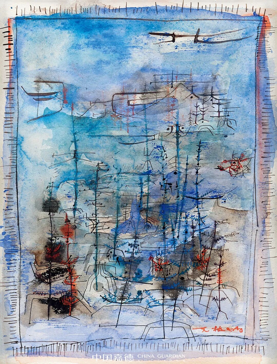 水彩创作在赵无极的艺术生涯占有举足轻重的地位,不能以单纯的草图视之,特别是50年代的水彩,多经过精心布局,结构完整精巧且寓意深远。如本幅在1953-54年画就的水彩作品《无题》即是如此,见证了赵无极赴欧发展初期的艺术探索。画面中,赵无极以其喜爱的普鲁士蓝色为底,敷已晕染,并在其上偶用深浅不一的洋红、褐色来突出景物,形成视觉对比与远近层次,再透过纤细有力、充满书法趣味的黑色线条,符号性地描绘出远方约略可见的山峦迭嶂;而近处瘦削的参天树木相间成林,不时有鸟儿从树梢飞掠而过,构成一幅氤氲隐约、空疏恬淡的秋日情景,当可与讲究高逸清冷的元代山水大家倪瓒笔下所作媲美。诚然,此作的表现方式与符号化构成在一定程度上或仍受到保罗·克利的影响,但在画面右上与左上已开始掺入中国古文字符号,且整体散发出来的依然是陶潜诗中“山气日夕佳,飞鸟相与还”的幽静气息,令人神往不已。