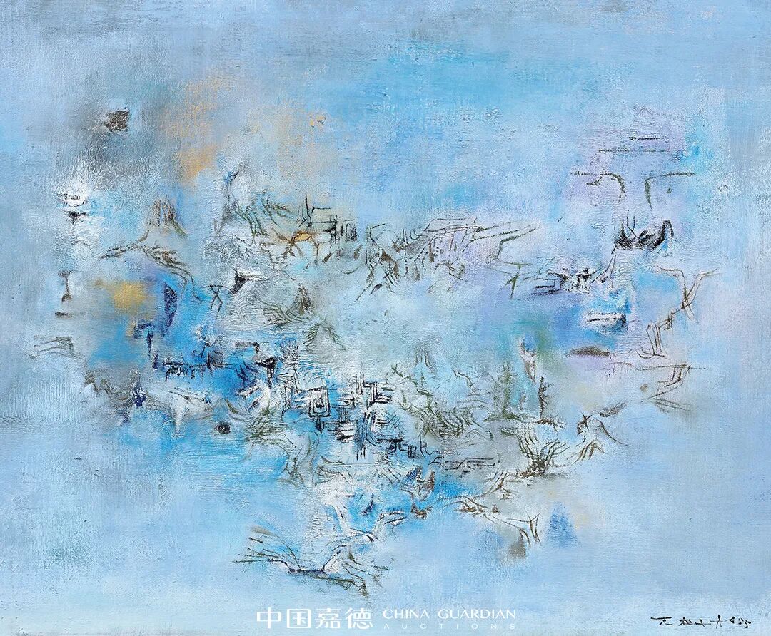 而当我们远观全幅,画面中心以古文造型细线勾画出的环状图形,俨然浮现中国地图的轮廓,对于故乡的眷念,令人欣喜动容。在赵无极超过一甲子的创作生涯中,《中国城》一作大大地扩展了他绘画中的东方精神,无论是对中国传统文化的再发现,或是对西方现代精神的吸纳反刍,都在本作做出最佳的演绎。更绝无仅有的,《中国城》是唯一一幅明确以中国地图为蓝本所绘制的作品,可说是深寓去国怀乡之情的最佳代表;赵无极选择他最喜爱也别具意义的天蓝色来构画呈现,表达祖国在其心中无可取代的尊崇,足见艺术家的巧思艺心与本作的珍稀。无论是艺术道途的求索,或是心灵的返归与映照,《中国城》都是“甲骨文时期”最具独一性、也最富故事性的一件,甚至可以说,是赵无极在五〇年代自我观照后,对本真的诠释。