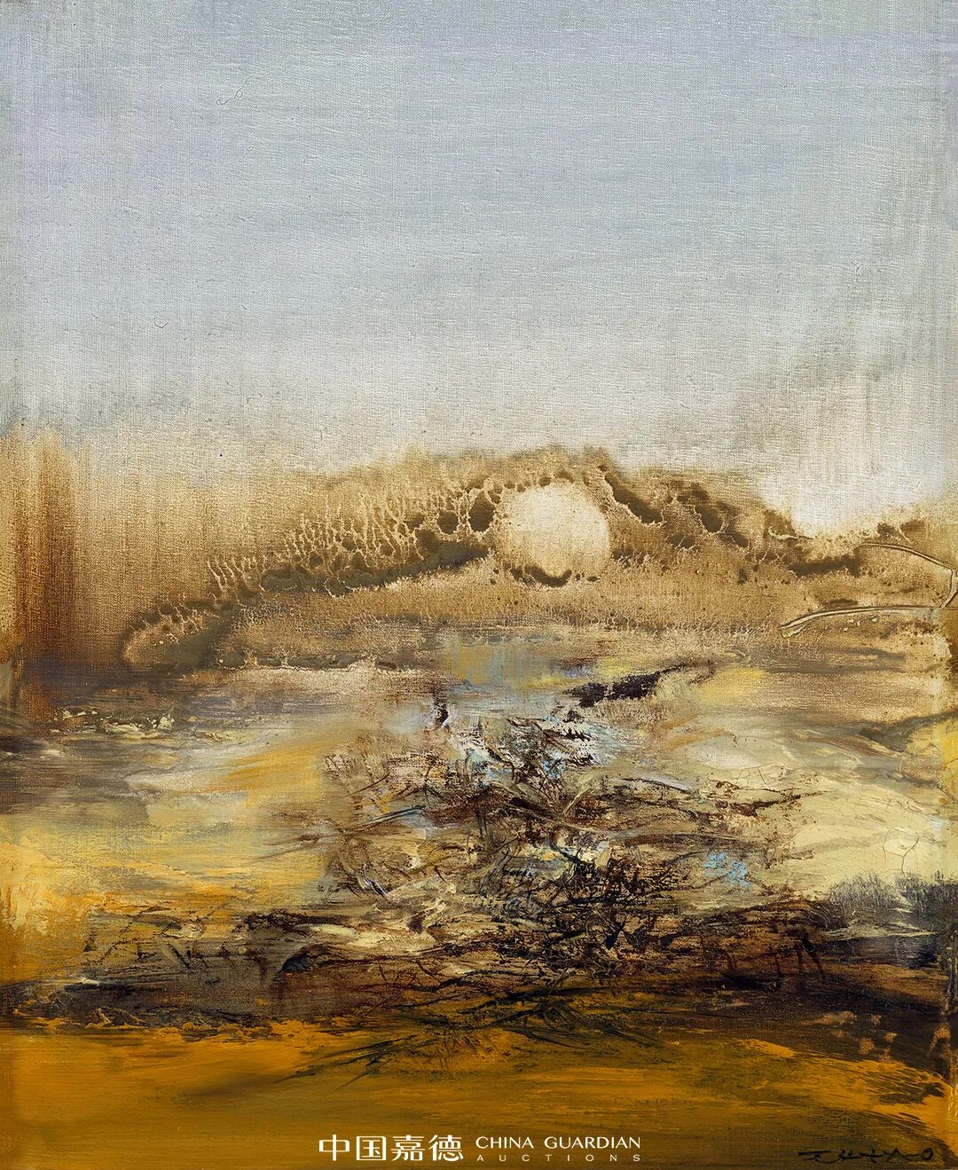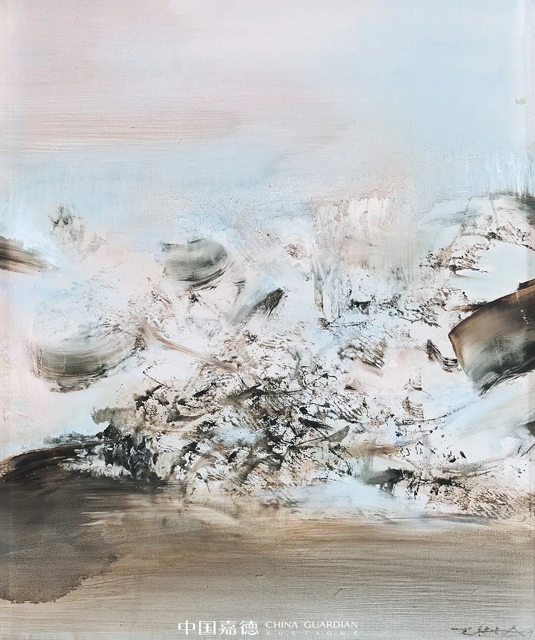 像是本季呈现的《26.01.66》为赵无极“狂草时期”精力勃发的代表作之一。在此,艺术家做了十分别致的布局,大致将画面分为上中下三等分,在万里无云的淡蓝色天空下,他以类似水洗效果的棕褐色隐约描绘出远方山形;前景则运用自由奔放的鲜明笔触,一路蜿蜒至观者眼前的黄土,形成富有韵律感的视觉节奏;而除了透过不同的技法处理,借凿为类似倪瓒一河两岸的书画经典构图形式,此外还偶发性地刮除部分颜料,形成犹如悠远时间所留下的几笔刻痕,体现了“天地玄黄、宇宙洪荒”的浑沌初始状态,等待人们去发现、挖掘深埋其中的种种事物,进而写下自己的历史。