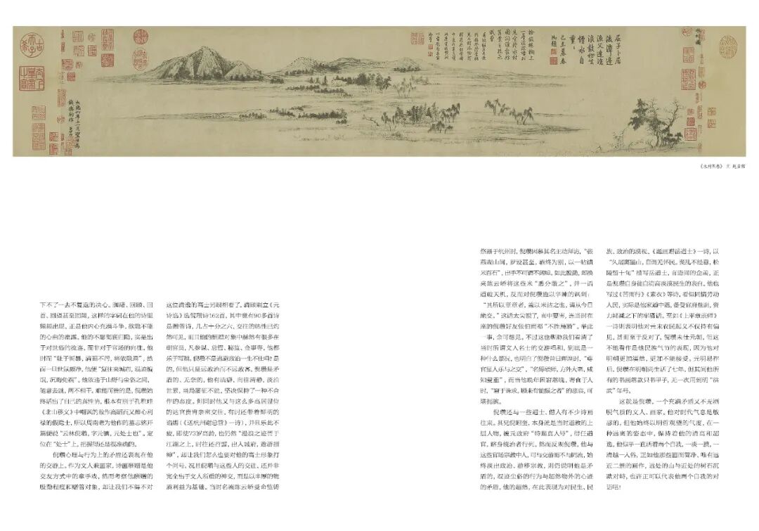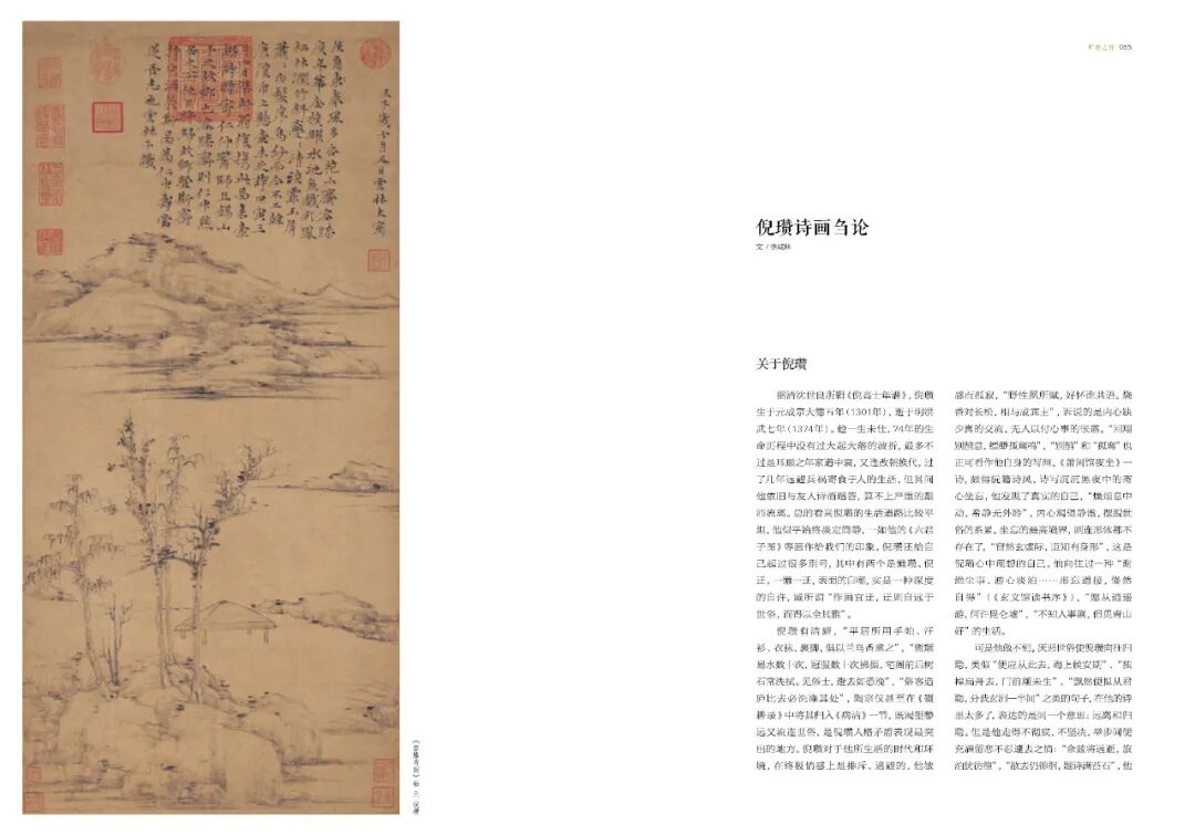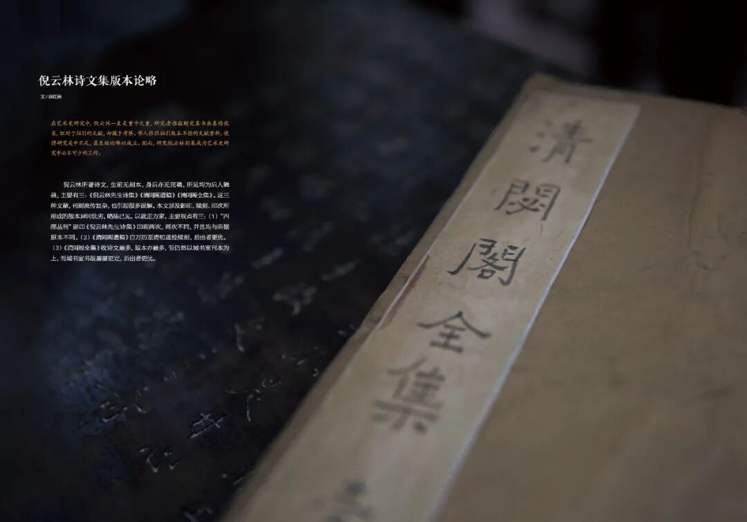 书籍以倪瓒开篇,精选《清閟阁全集》12篇诗文及《倪瓒和元代墨竹》、《倪瓒诗画刍议》、《倪云林诗文集版本论略》等。倪瓒一生性情清高孤傲,不事俗务,其绘画、书法、诗词皆达到了极高的艺术造诣。作品意境荒寒空寂,风格萧散超逸,简中寓繁,小中见大,外落寞而内蕴激情。其画多以干笔皴擦,笔墨极简,所谓「有意无意,若淡若疏」,形成荒疏萧条一派。明何良俊云:「云林书师大令,无一点尘土。」其绘画实践和理论观点,对明清数百年画坛有很大影响。倪瓒书法擅楷书,作品参禅学道,写出了他简远萧疏,枯淡清逸的特有风格。其书法真正做到了既「隐」且「逸」,既遒劲、精美,又率意、简逸。董其昌评曰:「古淡天真,米痴(即米芾)后一人而已。」倪瓒的诗造语自然秀拔,清隽淡雅,不雕琢,著有《清閟阁集》15卷。倪瓒亦是一个以复古为旗帜,而追求艺术个性化的艺术家,他既属于这个时代,又不属于这个时代,这就是艺术对时代的超越性价值。