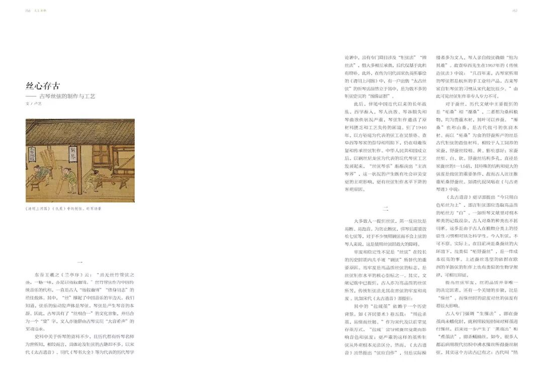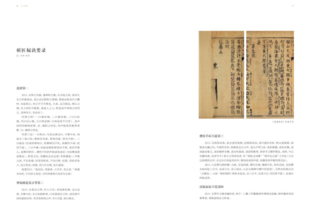 我们又采访了著名斫琴家、演奏家王鹏,为我们详细讲述了他当年修复中国艺术研究院所藏老琴的旧事,并介绍了修复古琴的方法细节;故宫副研究员闵俊荣,参与修复故宫所藏诸多名琴,也撰文探讨了古琴和漆的问题。编辑部独家校勘整理了斫琴古籍一种《斫匠要闻秘录》并有古琴丝弦制造、国家博物馆藏古琴考据、民国古琴唱片考据、琴制辨析、古琴流派介绍等数篇佳作,这对大部分琴人来说,是极为难得的学习材料。