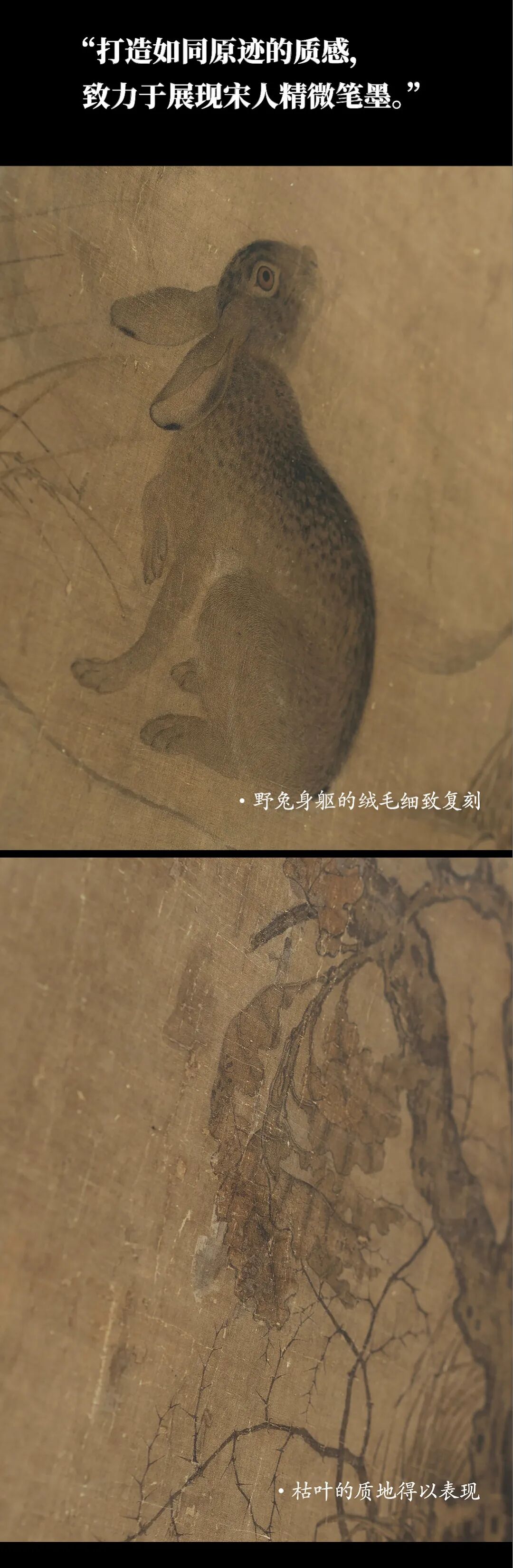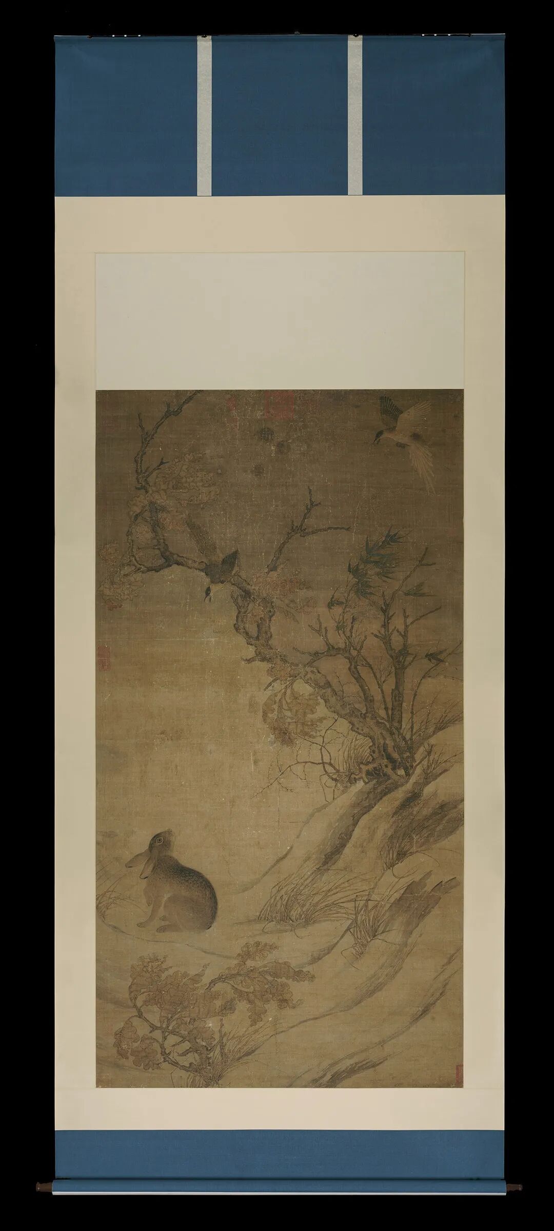 作为北宋花鸟画的问鼎之作,『双喜图』中描绘了一场生动的「对峙」:依据巧妙的构图设计,观者面对画面时,视线首先关注位于「画眼」的兔子,而后随其回首的姿态,自然而然向右上角探望,由此产生「动势」。