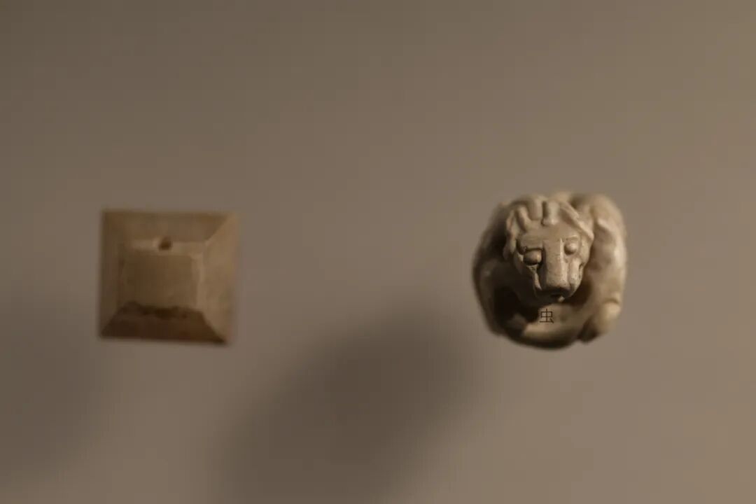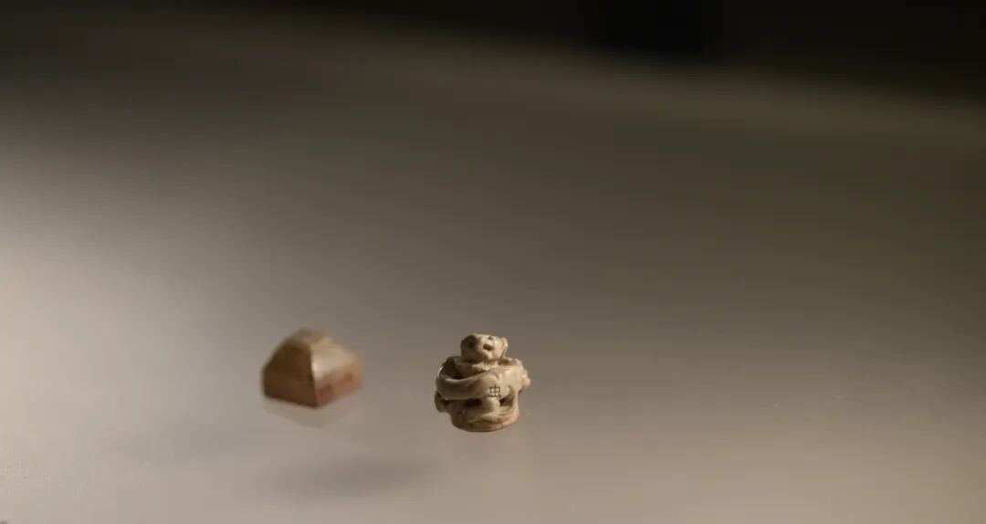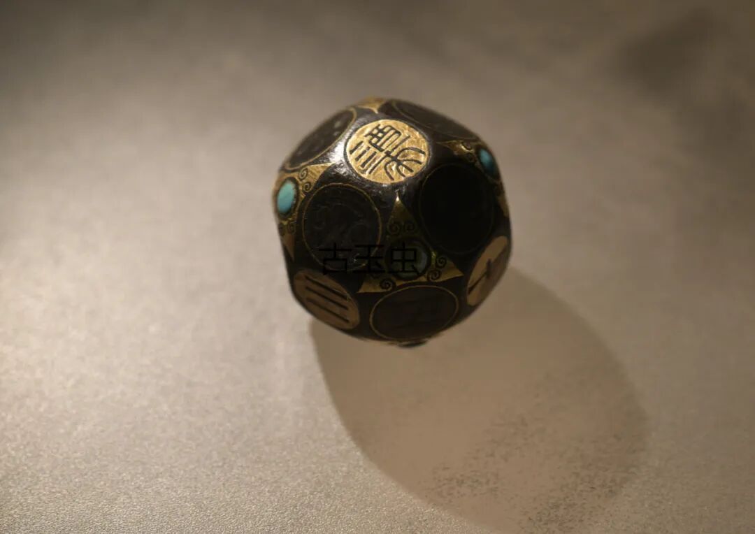 这件铜骰有“酒来”铭文,用于饮酒行令,它的18个削面分别用篆书错写 “一”至“十六”以及“酒来”“骄”字。