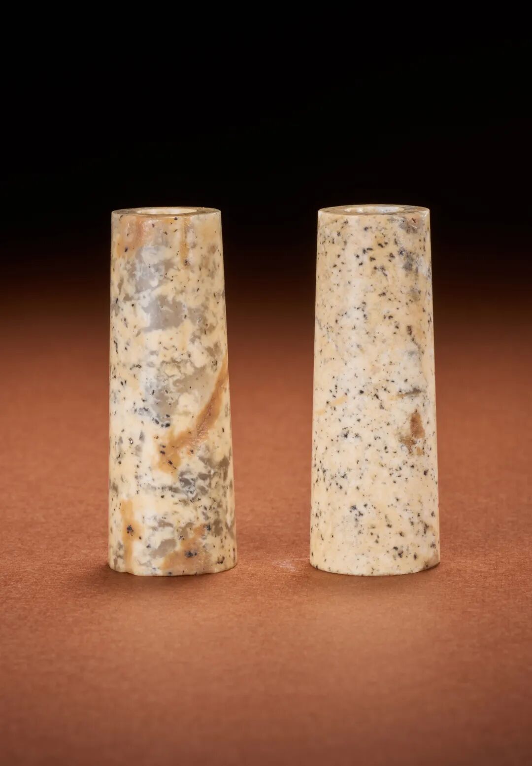 此标的旧玉素勒一对,玉勒呈圆柱体,从两端的孔洞可见明显的工艺特征。玉勒局部受沁,呈色深沉而富有变化,古雅内敛,光素无纹,但玉质之美、沁色之美、原始的素雅朴拙之美扑面而来,令人爱不释手。