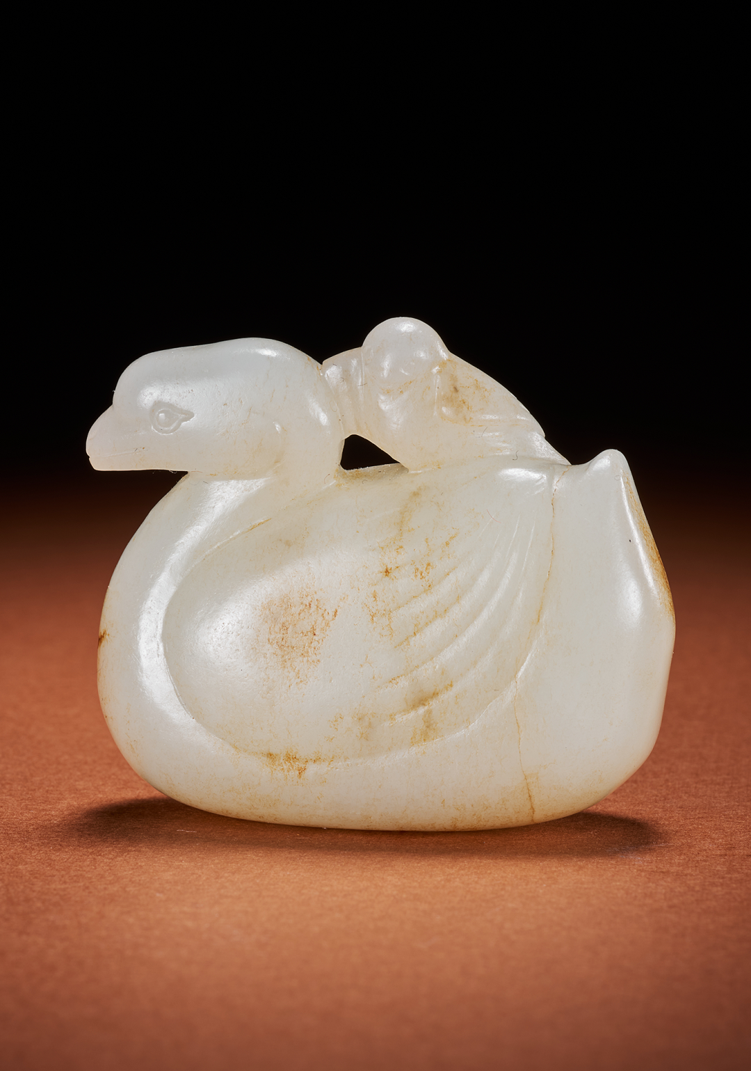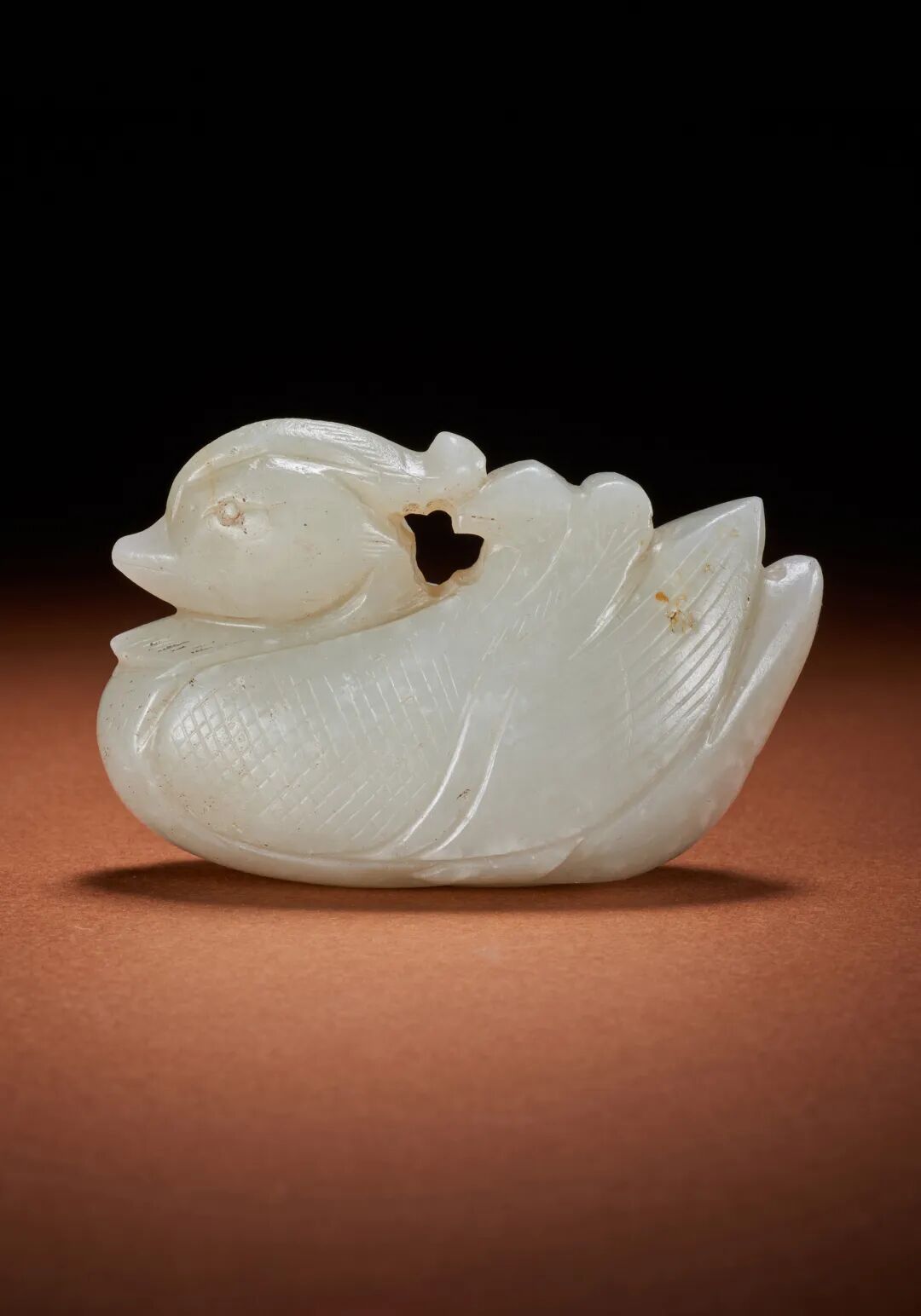 青白玉为材,琢鸳鸯一对,彼此依偎嬉戏。莹润有泽,局部受沁。鸳鸯头上翎毛飘逸,昂首挺胸,翎羽张扬,双翅收拢,飞羽覆羽刻画精致娴熟,以效游弋水面之姿,中部有通孔。鸳鸯,又叫匹鸟,《古今注》记“鸳鸯、水鸟、凫类,雌雄未尝相离。”基於人们对鸳鸯的这种认识,自古被视为爱情的象征。本品材质工意俱佳,为难得收藏把玩精品。