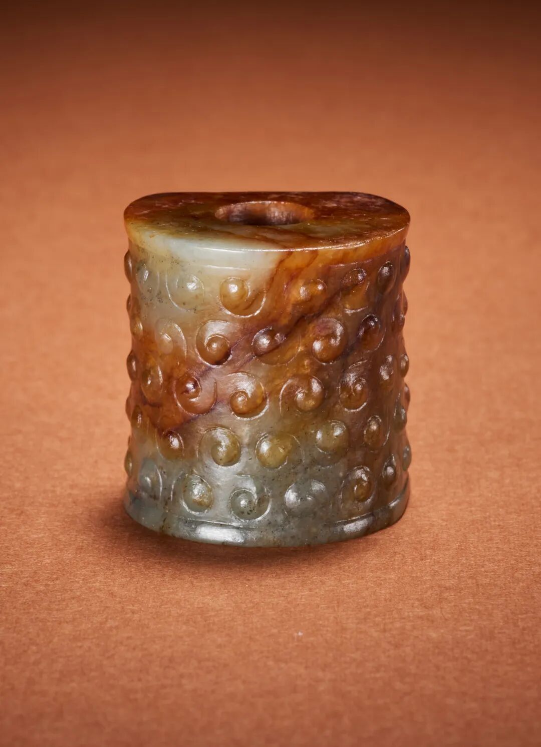 玉勒青玉质,细腻温润,表面受沁。整体作圆筒形,表面浮雕装饰谷纹,谷纹颗粒精致而饱满,带有富足的象征意义。勒子造型古朴典雅、精致美观,沁色丝缕深入玉质肌理,沧桑老熟之感一望可知。