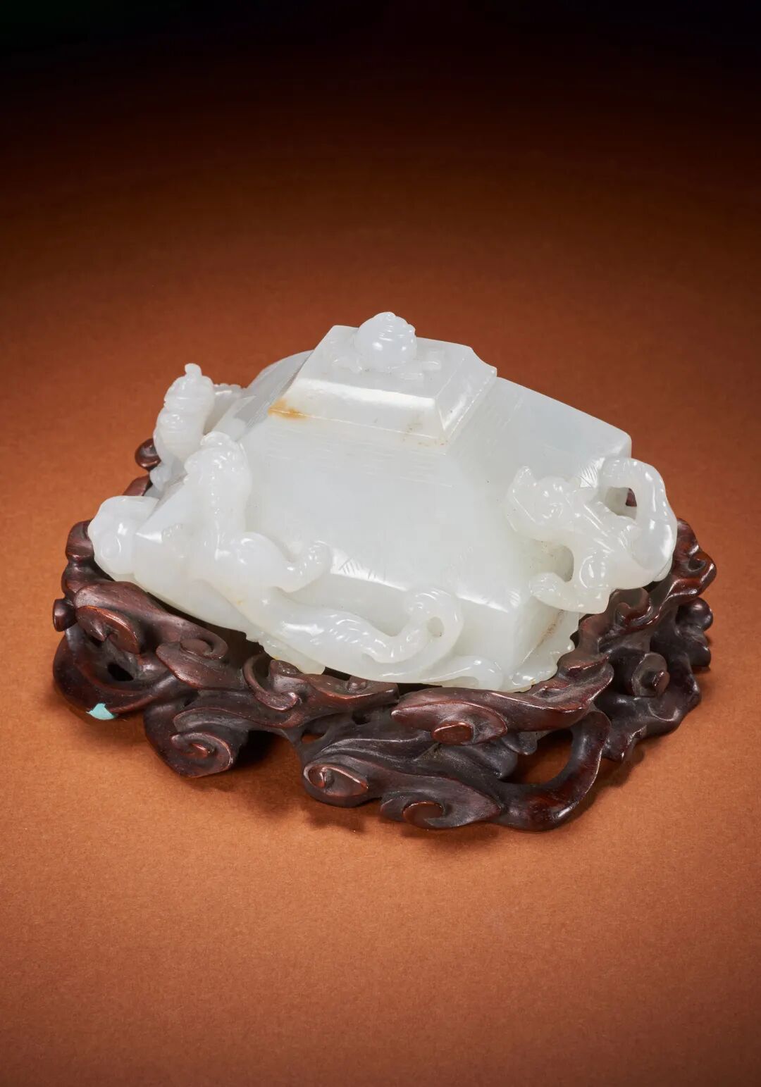 取整块和田白玉为材,洁白温润,造型新颖,以长方形为体,螭龙围绕,广腹小口,器身镂空雕琢三条螭龙,造型各异,伸头弓身攀附外壁,长尾贴于下部,气势灵动。掏膛干净利落,子母扣和严密,呈现出高超的工艺水平,实为工料俱佳的一件文房用品,配随型双龙红木底座。