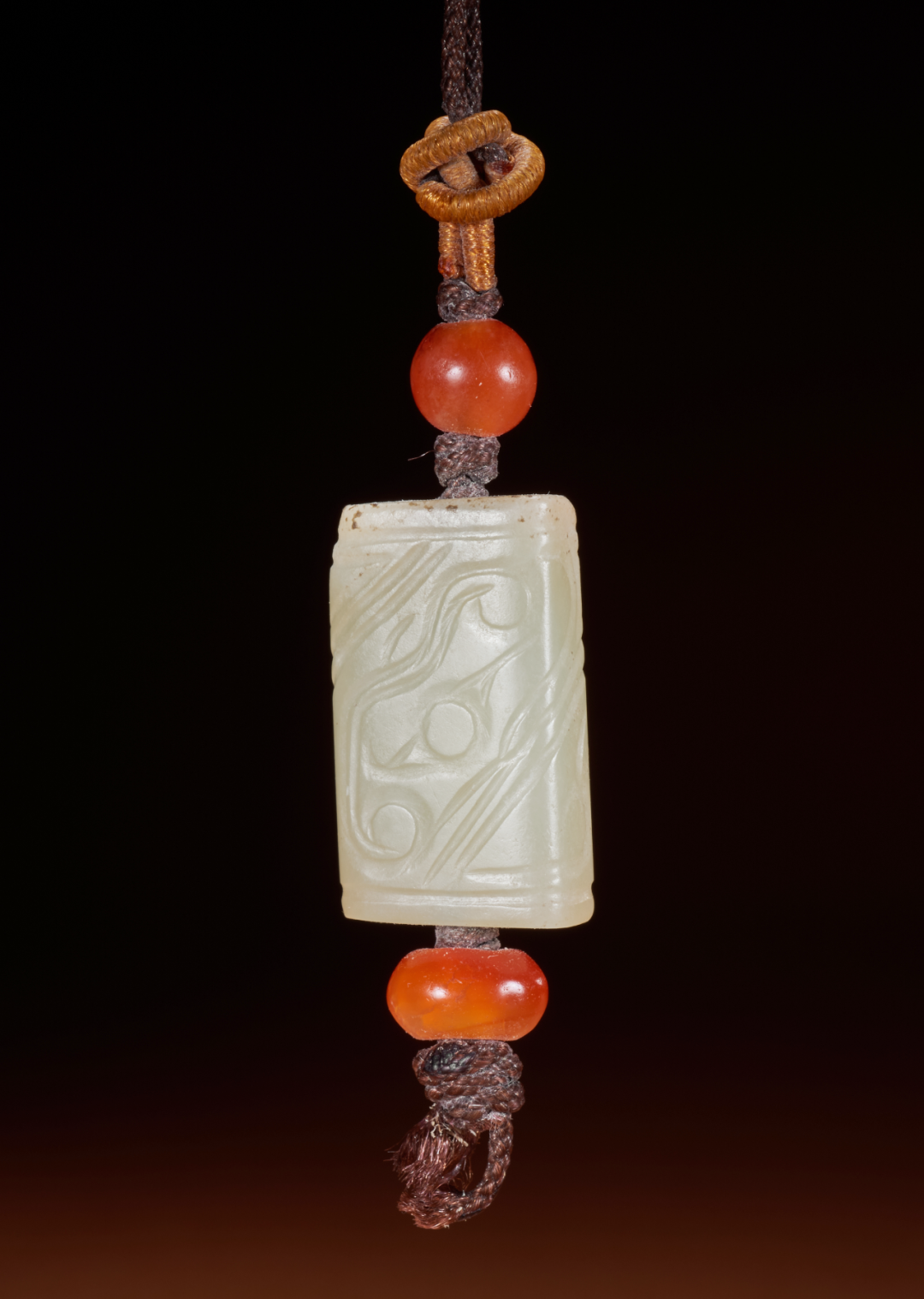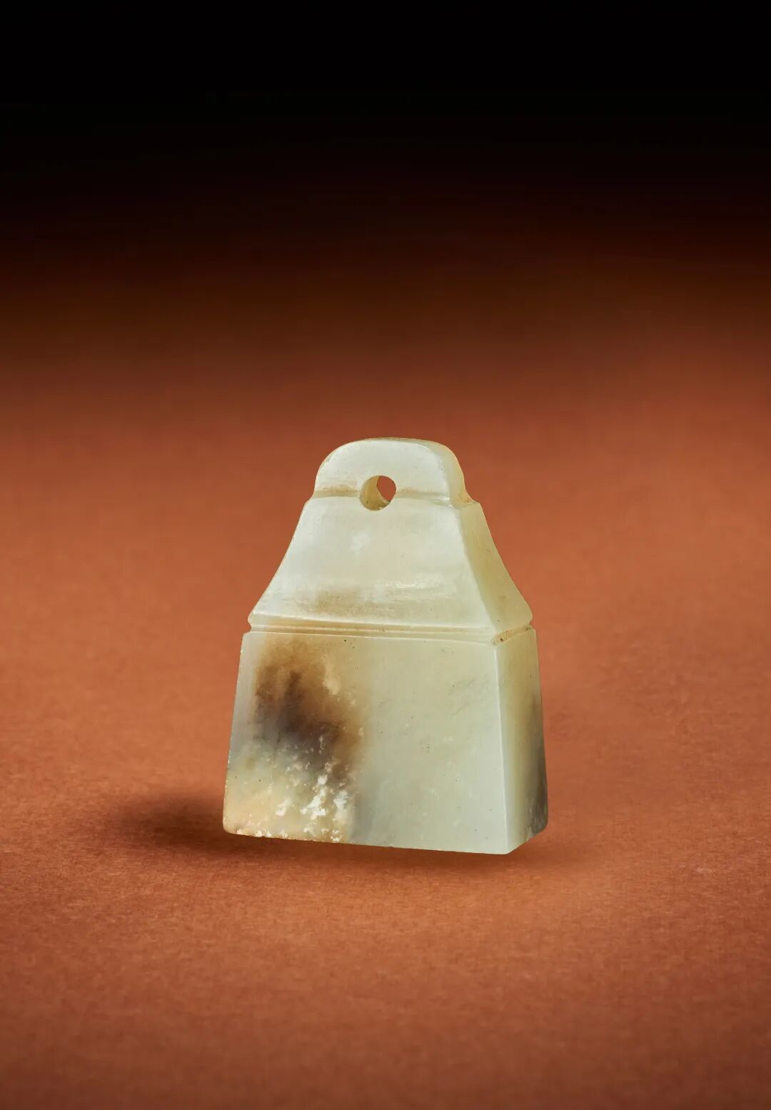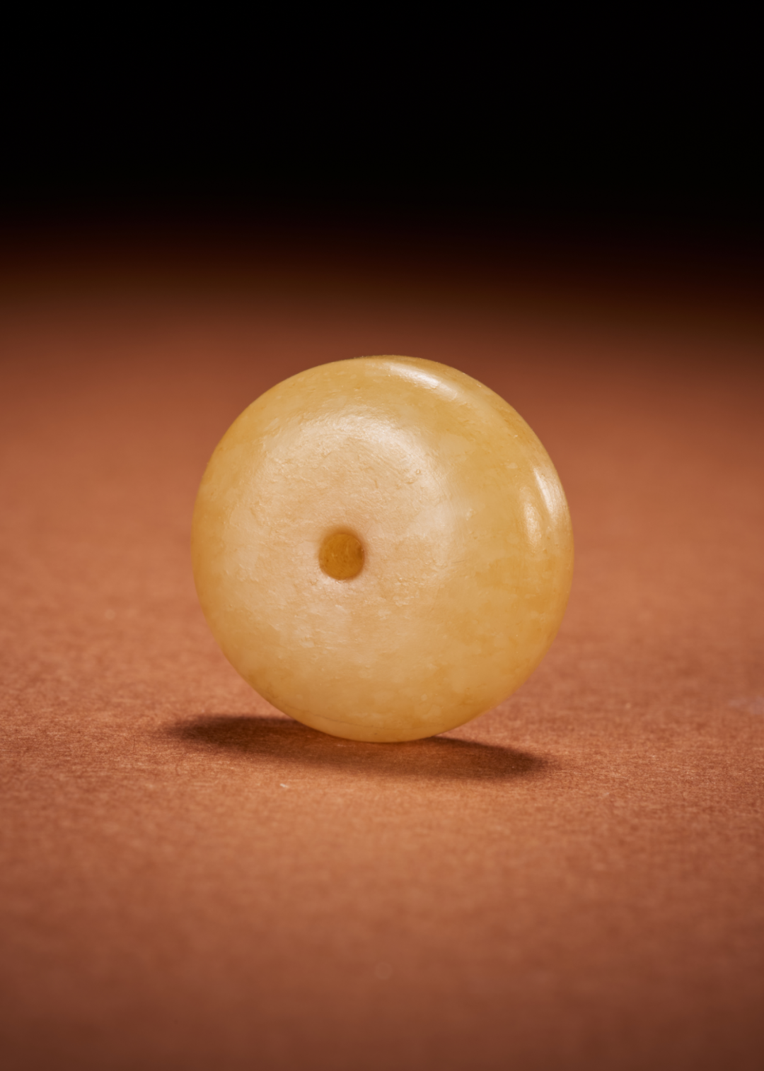 白玉质,温润细腻,表面带红色沁。造型圆润,棱线清晰,中间有圆柱状小孔,可供穿系,打磨细腻。整器造型简约,风格古拙,风格明显,实属难得佳品。