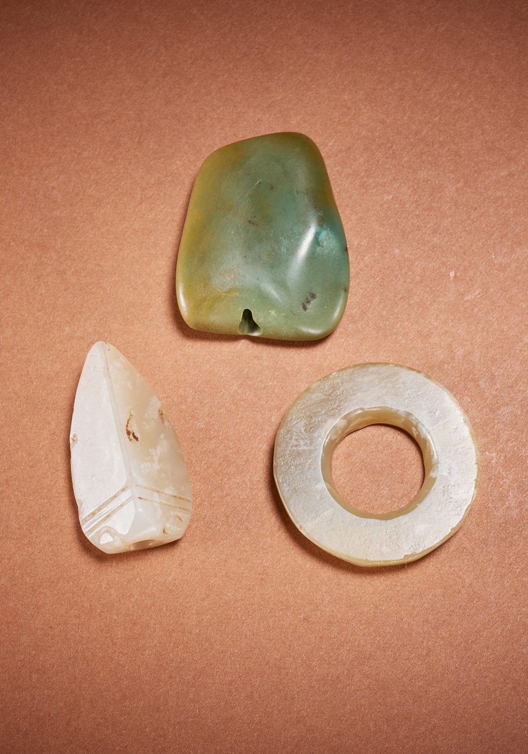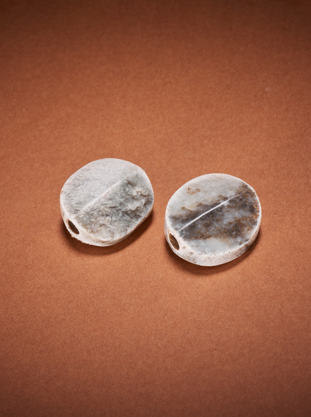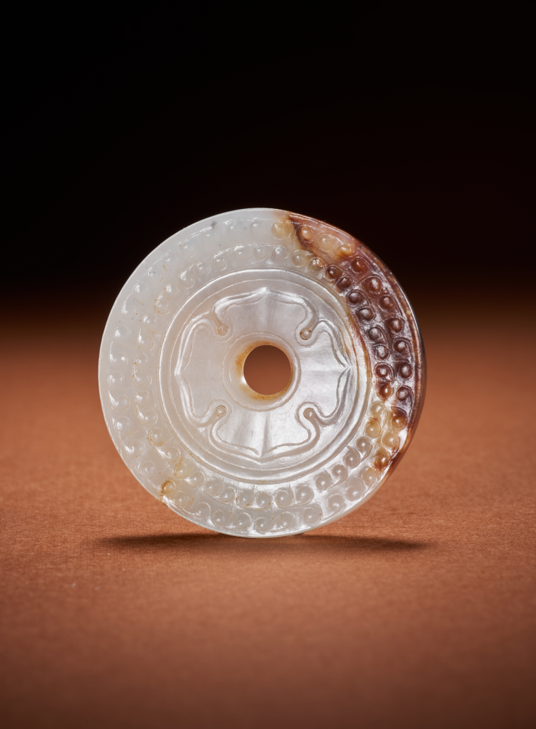 白玉质,温润细腻,表面带红色沁。造型圆润,棱线清晰,中间有圆柱状小孔,可供穿系,打磨细腻。整器造型简约,风格古拙,风格明显,实属难得佳品。
