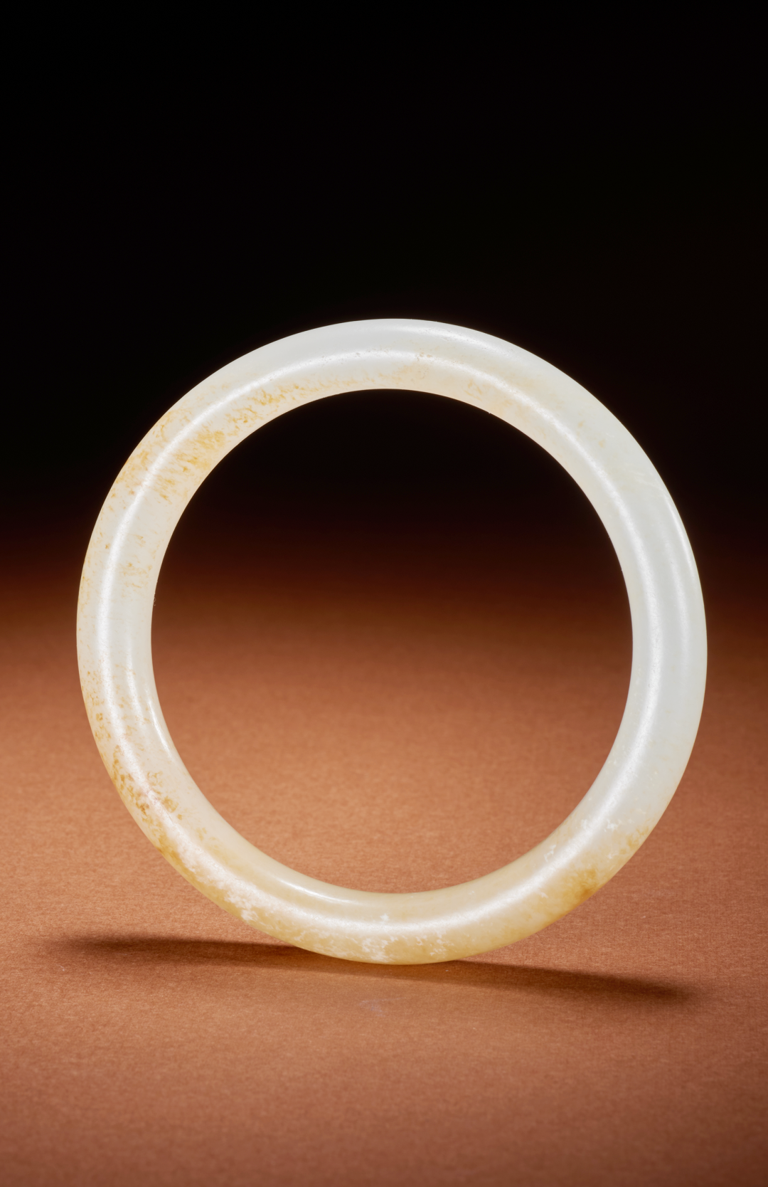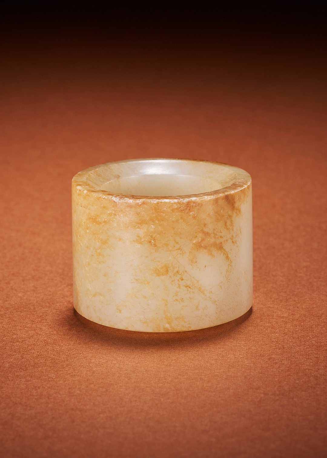 白玉质,温婉细腻,质地紧密,表面受红色沁。通体莹润亮泽,厚重大气,雕工精致,打磨细腻。造型简洁大方,耐人寻味。扳指,又有韘、决之名,古已有之。后演化用来展现拥有者财富、地位。清代乾隆帝在玉配件中尤喜扳指,认为其“恰似环琚”、“德美信堪师”,评价极高,更是将其作为伴随左右的良师益友。