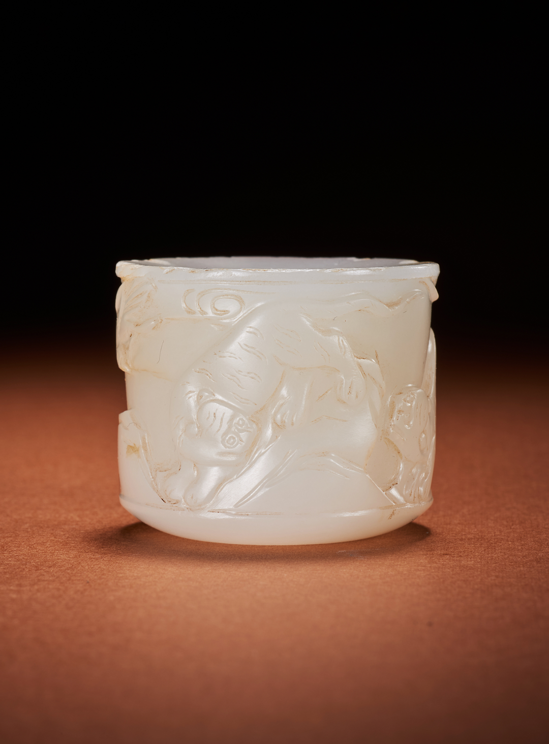 玉质润白,微受沁。呈圆筒状,上端边缘内敛,下端边沿则外凸。外壁减地浮雕双虎嬉戏纹饰,设计巧妙,刻画纹饰流畅,布局疏朗有致,工艺精巧,可玩可赏。