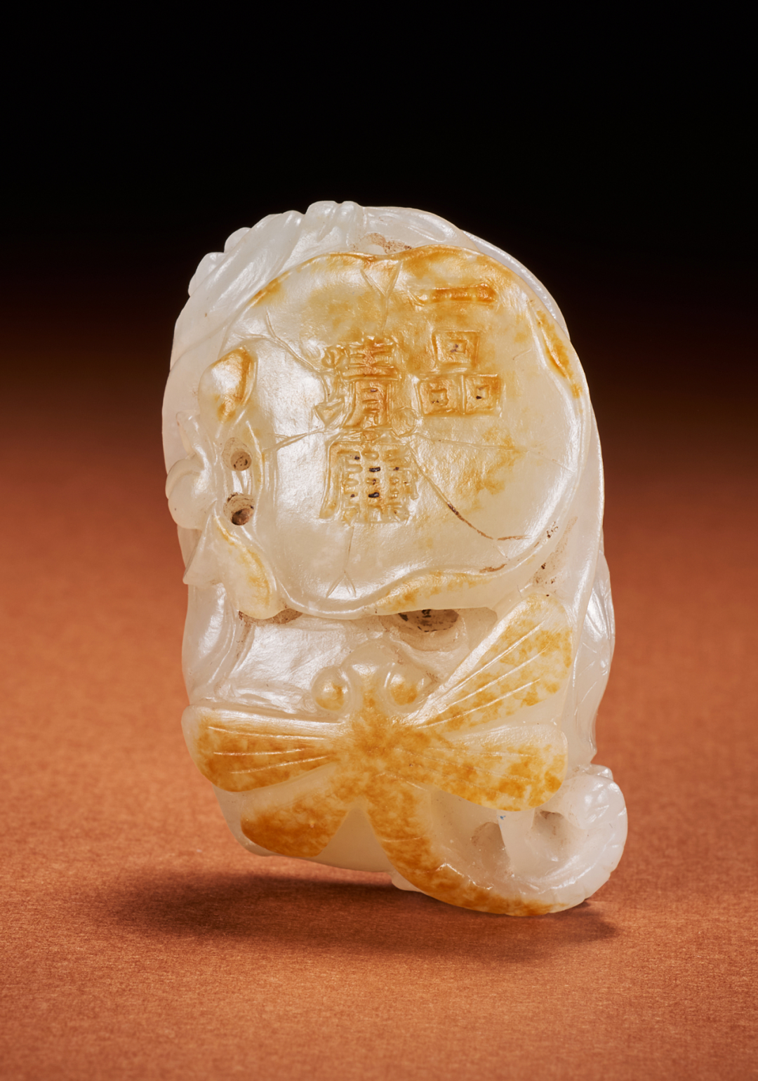 白玉雕琢而成,玉质洁白温润,洁净细腻,背面俏色留皮。整体造型饱满,圆润流畅。立体圆雕莲蓬,圆鼓饱满,莲子粒粒饱满硕大,叶脉浮卷,轻盈回荡,伸展牵延。背面雕琢荷叶和蜻蜓,荷叶上雕刻“一品清廉”四字。布局巧妙紧凑,枝蔓弯曲扭转,形象生动,富有雅趣。此件质地精良,体量适中,手感极佳,犹适把玩。