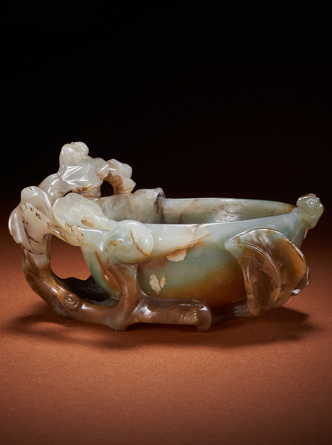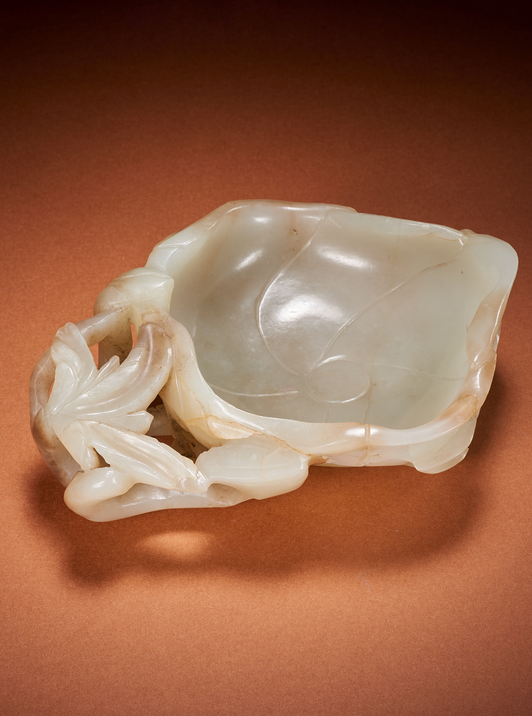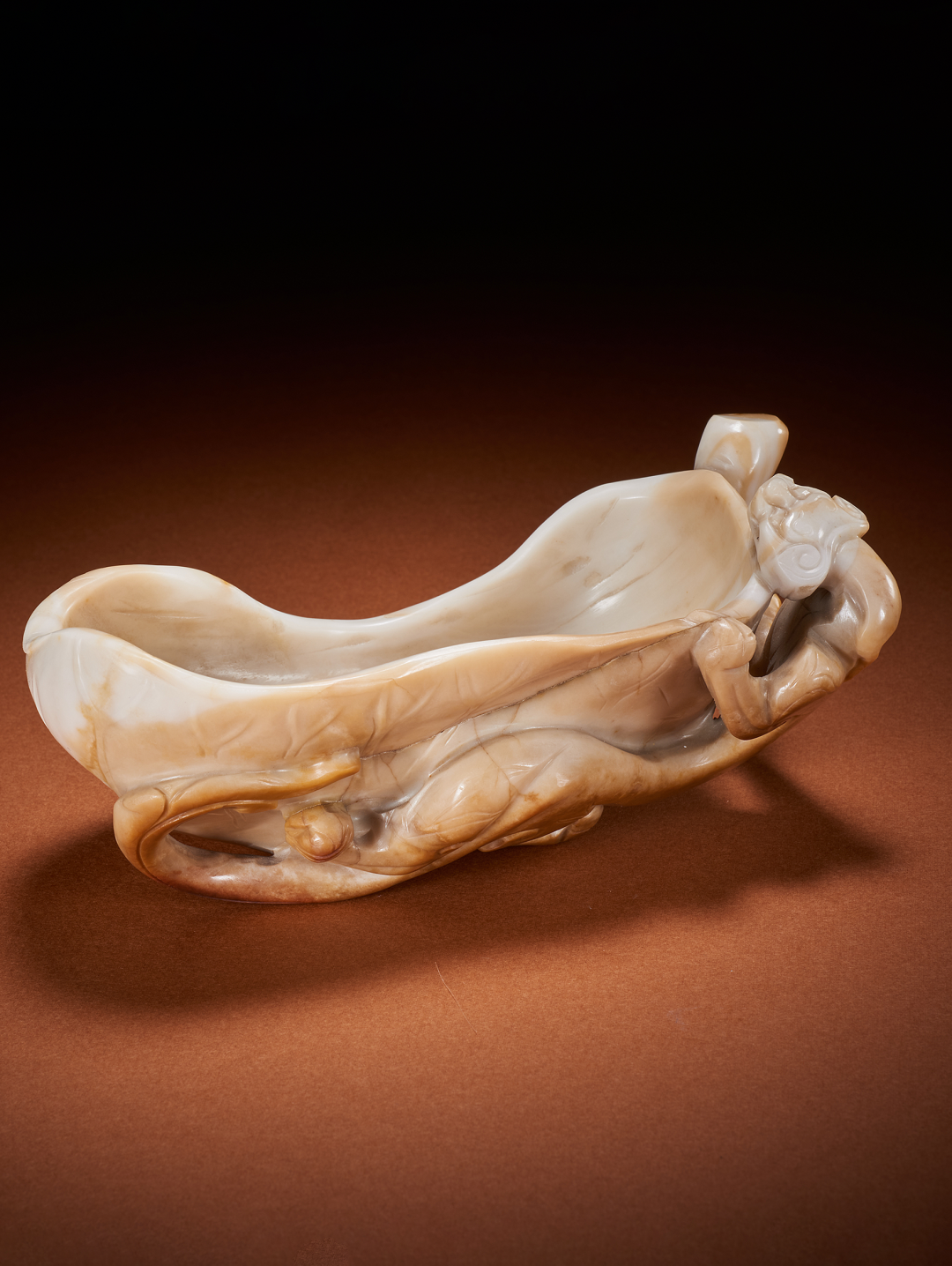 此件青白玉雕刻,局部有褐色沁斑。主体为一片波折皱卷的荷叶,边缘起伏上卷,中部低凹成杯体。内外壁阴刻条条筋脉纹饰,杯外壁镂刻一段莲茎盘结,荷叶卷曲,环绕杯体,以为杯足、杯柄。整器构思巧妙,刀功精湛,把玩收藏皆宜。
