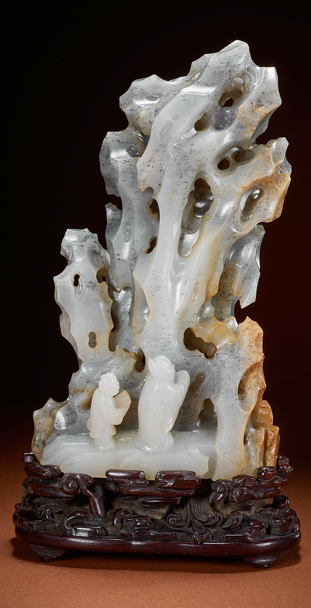“米芾拜石”是古代著名的文人典故之一,发展到明清时期,文人雅士追慕前贤,继承了很多经典的题材,见之顿生闲情雅趣之感。整器由白玉雕成,玉质温泽,做工规整,精细生动。立体雕琢一座高大有孔洞的太湖石山景,石前有一位头戴幞帽,身着宽袖束腰长袍的长者和一随童,对面前湖石做弓身拱手作揖状,主题明显为米芾拜石像。背面琢刻诗句“元章爱砚复爱石,探瑰抉奇久为癖。石兄足拜自写图,乃知颠名传不虚。”生动表现出米芾嗜石的痴狂。全器琢工细致,构图优美,高雅脱俗,山石浑圆雄伟。匠师巧妙利用玉材天然之型态、玉色与纹理,镂雕出奇异怪石,奇石高大耸立,峥嵘嶙峋,形态万千,气势憾人,极具立体感,下配红木底座,是一件非常难得的玉雕文人陈设精品。