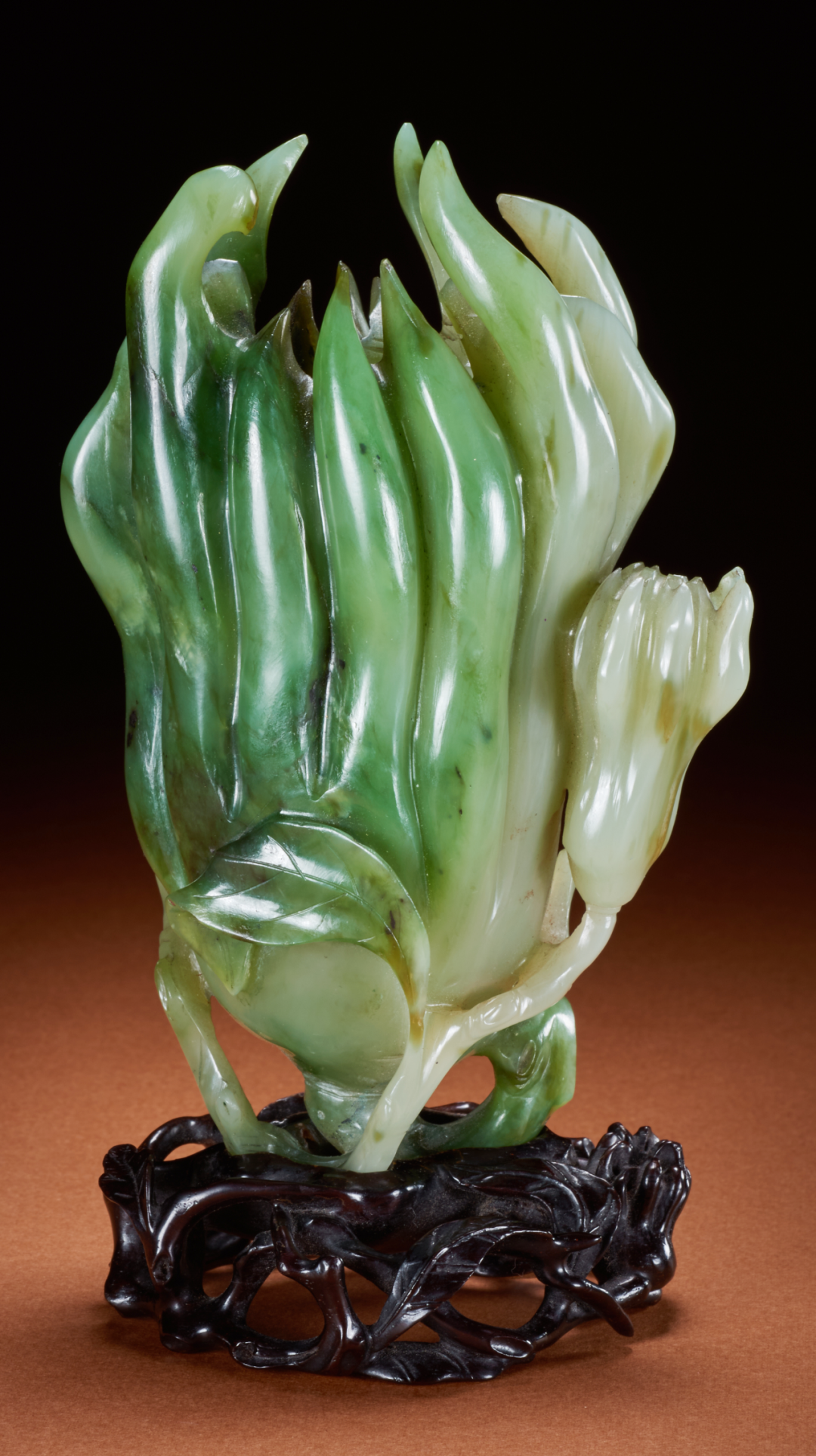 碧玉圆雕佛手,质地莹润,佛手镂雕而成,手指拢成,中空,底部镂雕枝梗蜿蜒曲折,器型丰硕饱满,转折清晰自如,琢叶片和小佛手攀延向上,有开有合,叶纹生动逼真,细节处线条圆润,生机勃勃。下配红木底座。佛手因其形状奇特似手,千姿百态,让人感到妙趣横生。此品雕琢精细,造型自然逼真,表面肌理仿如真物,宝光柔和迤逦,是一件不可多得的玉制精品。