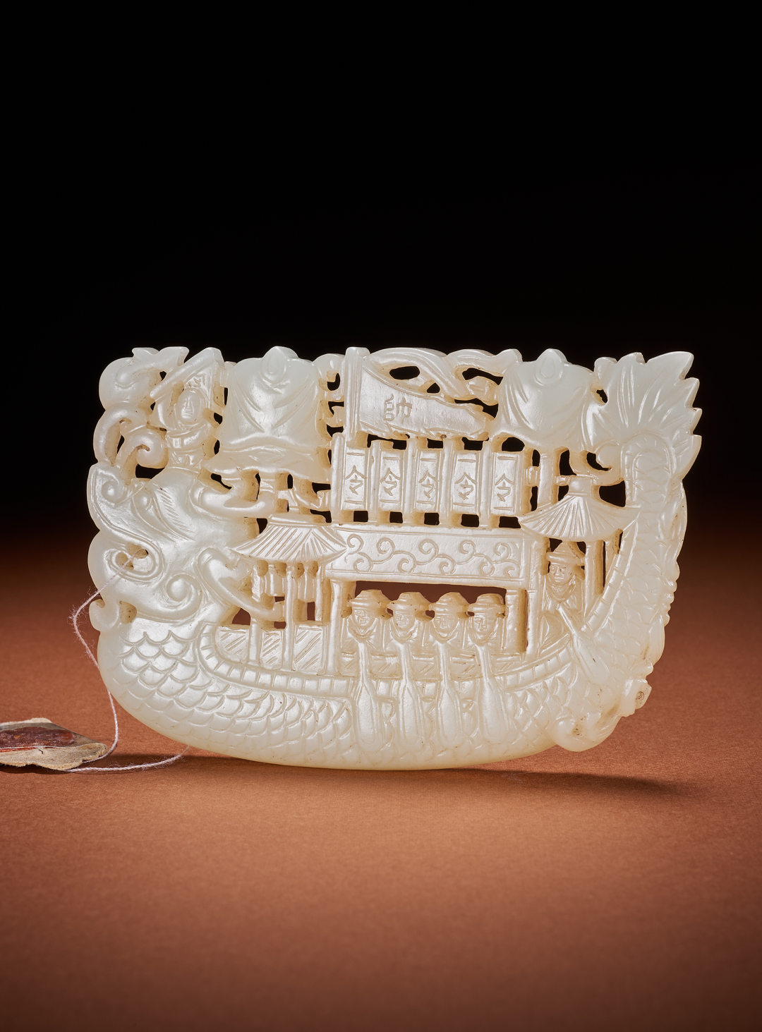 此品取材白玉,光润细腻,油润浑厚。主体雕琢龙船,船头龙首额头饱满凸起,龙角上扬,双眼炯炯有神,张口露齿,龙须卷曲,周身满鳞,龙尾高耸,花叶形尾鳍随风飘洒,风格威武霸气,气势非凡。龙身为船舱,两侧各雕琢四人,手持船桨,奋力滑行,船头龙首之上一人摇旗助威,目光炯炯,神情非凡。船尾一人摇橹,以控方向。船身上饰有飞檐亭阁建筑,亭台楼阁之上又有旌旗迎风飞扬。龙形像雕琢精美华丽,人物神态刻画细腻逼真,刀工流畅,细微之处碾琢到位,完美的展现出了激流勇进、蒸蒸日上的精神追求。威武霸气,构思奇巧,艺术张力十足,是一件题材特殊、品相完美的收藏佳品。