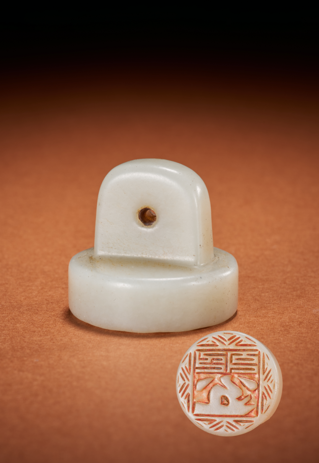 玉押白玉琢之,细腻油润。玉印为圆形,形制规整,印钮厚实,中穿一孔。印文笔划舒展,布局充盈印面,视觉效果协调、方正而平稳,流传至今日实为难得。