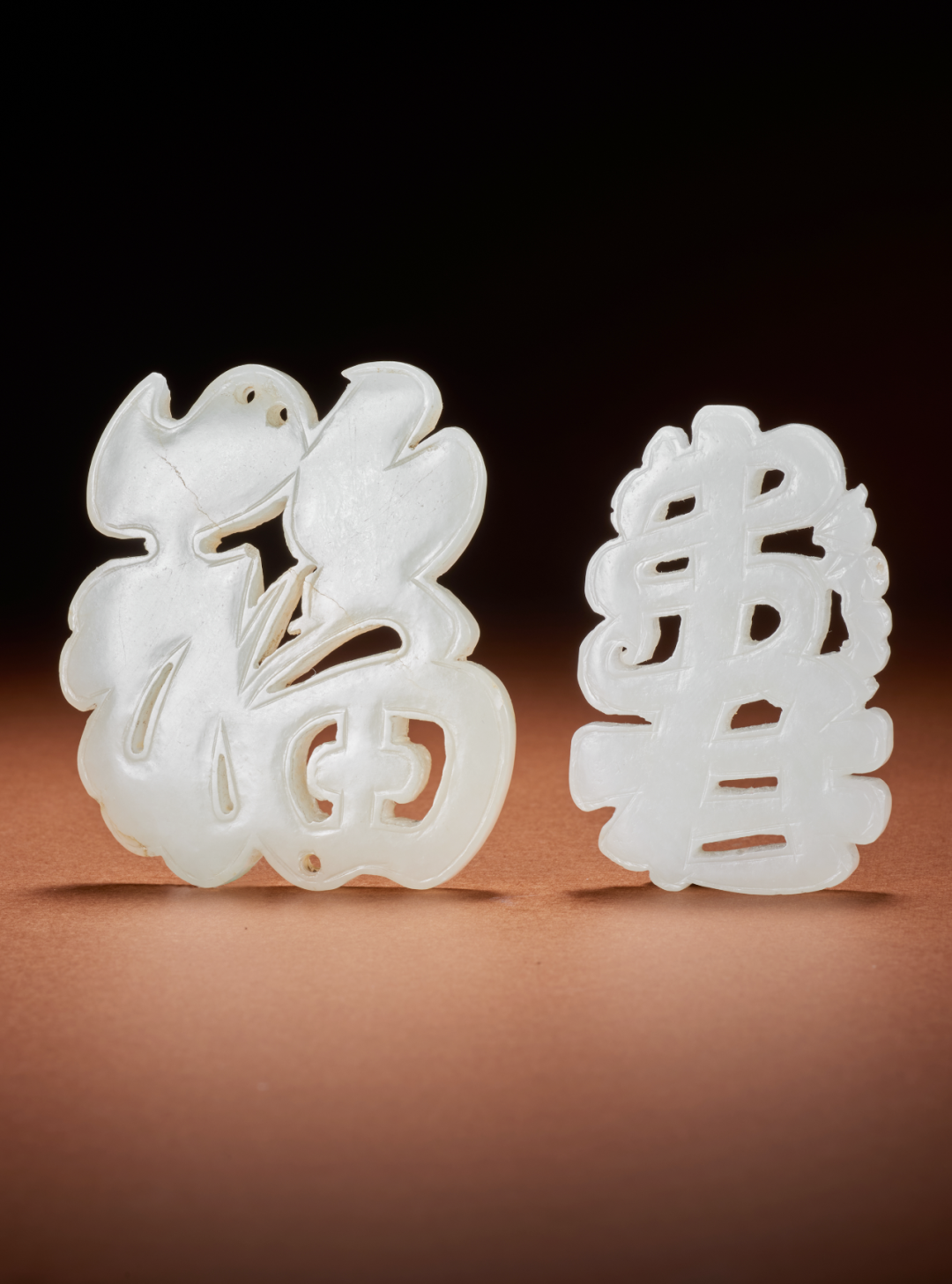 此标的由2件玉饰组成,和田白玉质,坚密莹润,打磨光洁,质感有加。采用镂空技法分别雕琢“福”、“寿”两字,象征福气、长寿。整器规整端庄,字形圆润雅致,刀法流畅劲健,线条流畅毫无阻滞感,琢磨细致去底平整,寓意吉祥,构思巧妙为福寿双全之意,材艺双美。