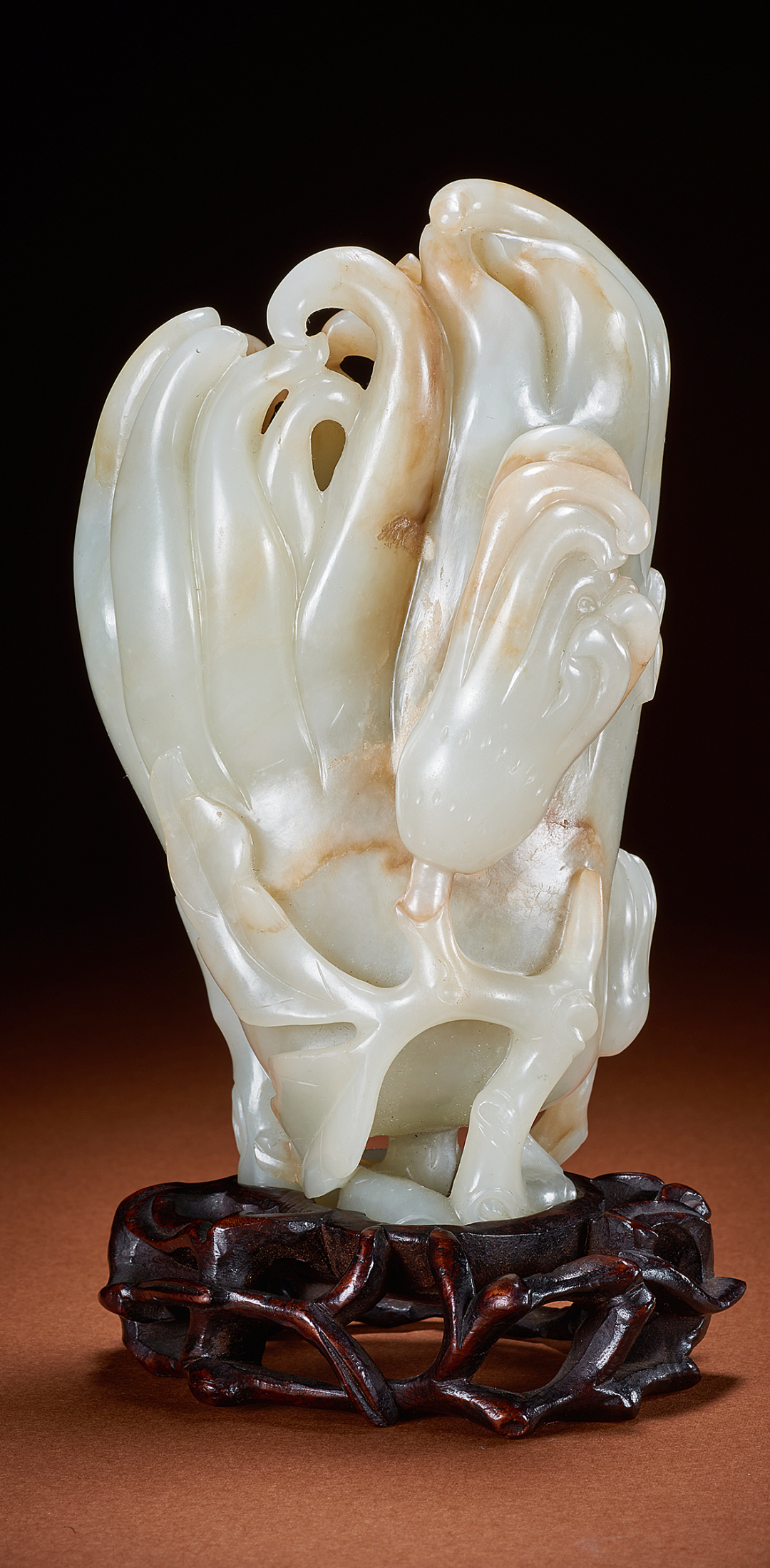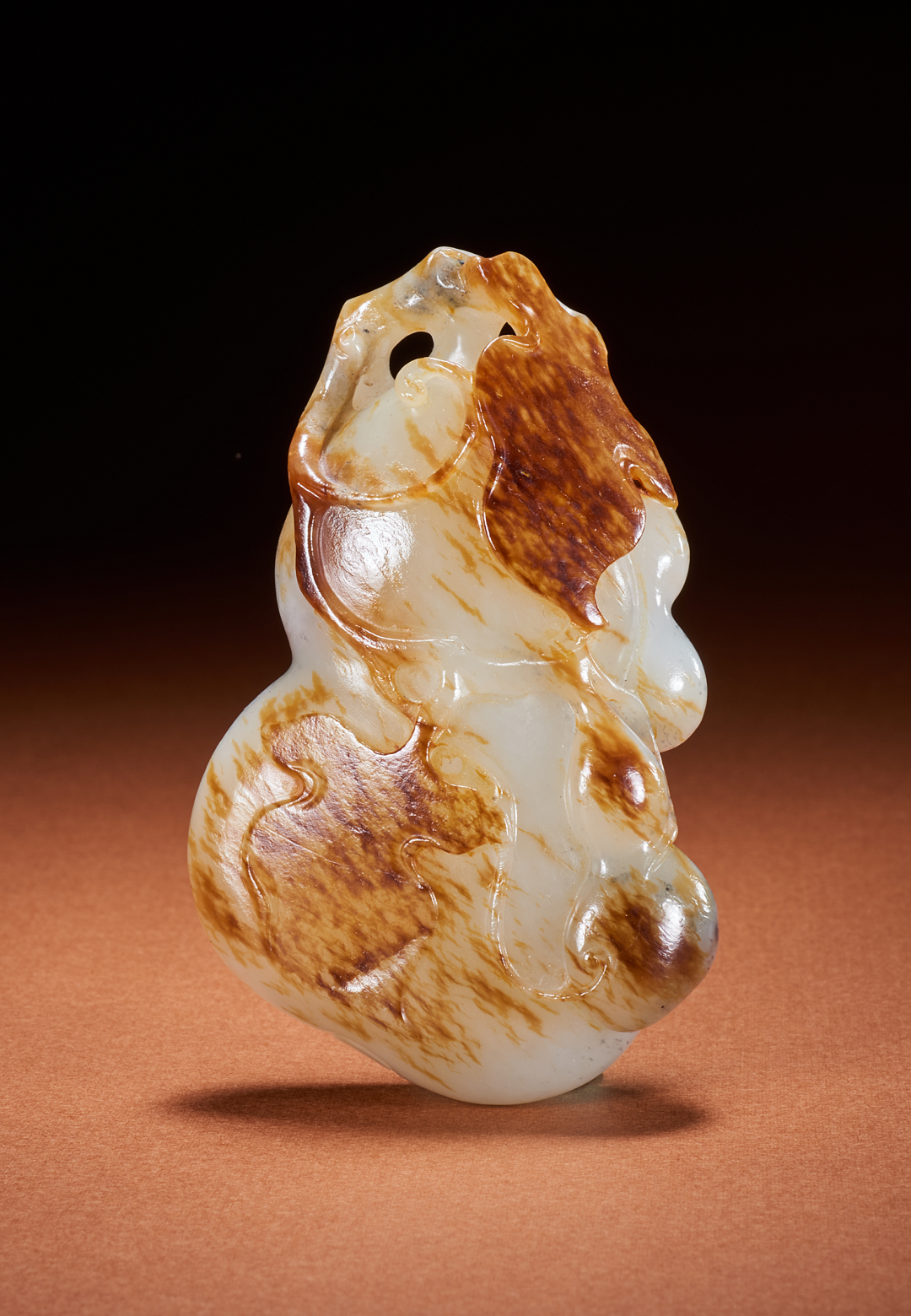 白玉质,细腻温润,背面俏色留皮。圆雕及镂雕相结合,雕琢大小葫芦,器形圆鼓,顶端生出葫芦藤,枝叶翻卷,须蔓缠绕覆于器表,大小葫芦相互依偎,惹人怜爱。葫芦素面清雅,繁而不乱,层次分明,葫芦多籽,故有多子多孙之意,葫芦在传统文化中也有“福禄”之意。此件雕琢工艺精湛,打磨得当,寓意吉祥,为不可多得的玉雕精品。