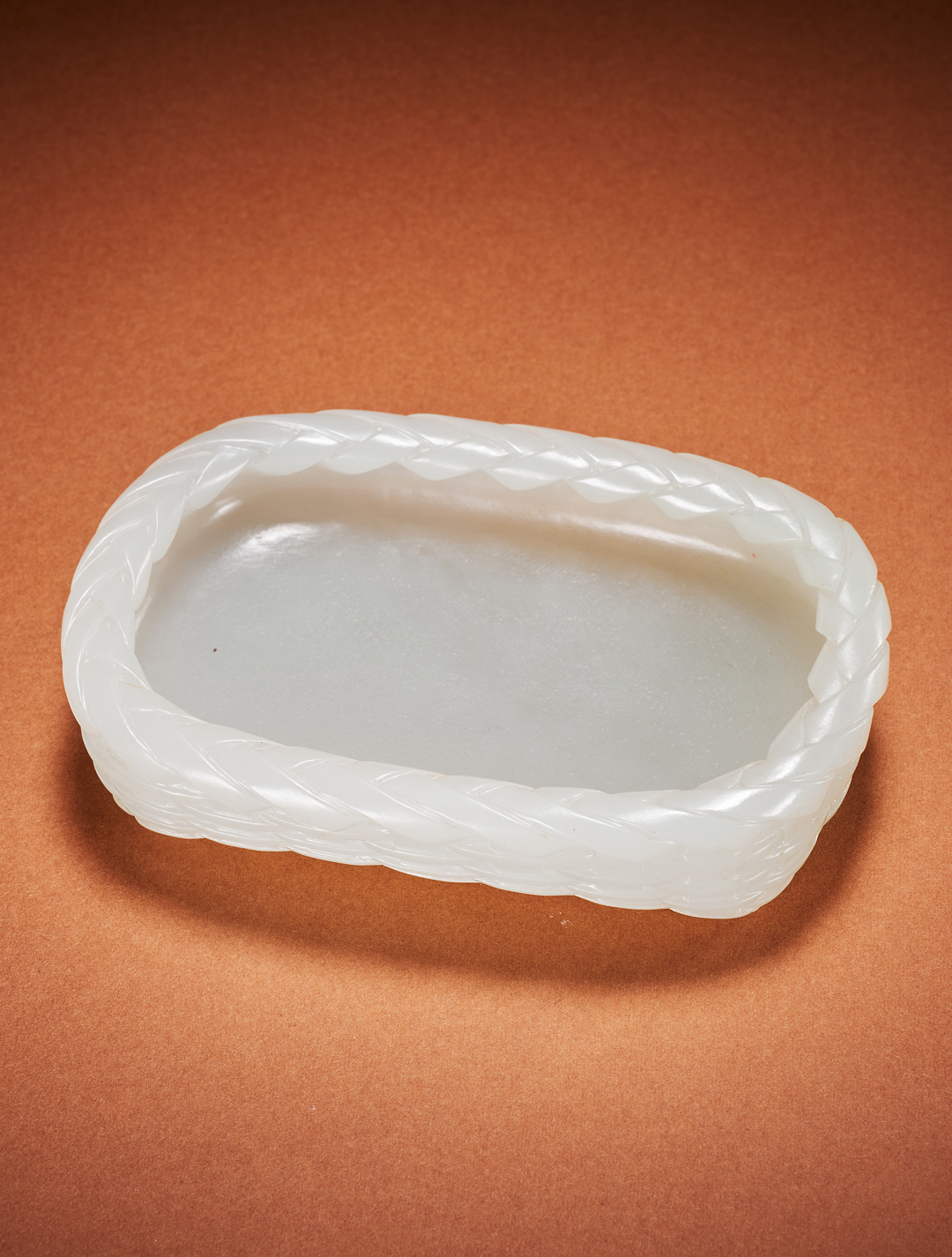 水洗取白玉为材,色如凝脂,质地温润,坚实细腻,材质上佳。整器满饰簸箕纹,极具立体感。造型新颖独特,刻刀老辣飘逸,纹饰自然清风,雕工细腻精美。整器用料精细,琢刻纤巧细腻,轮廓圆润立体,传达率意洒脱之独特意境,是难得的文房玉雕佳作。