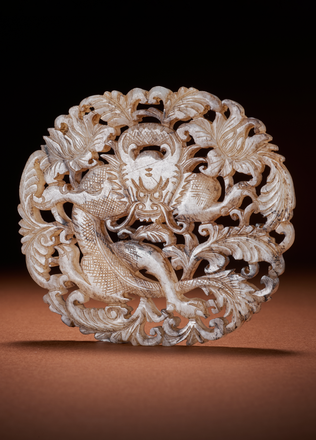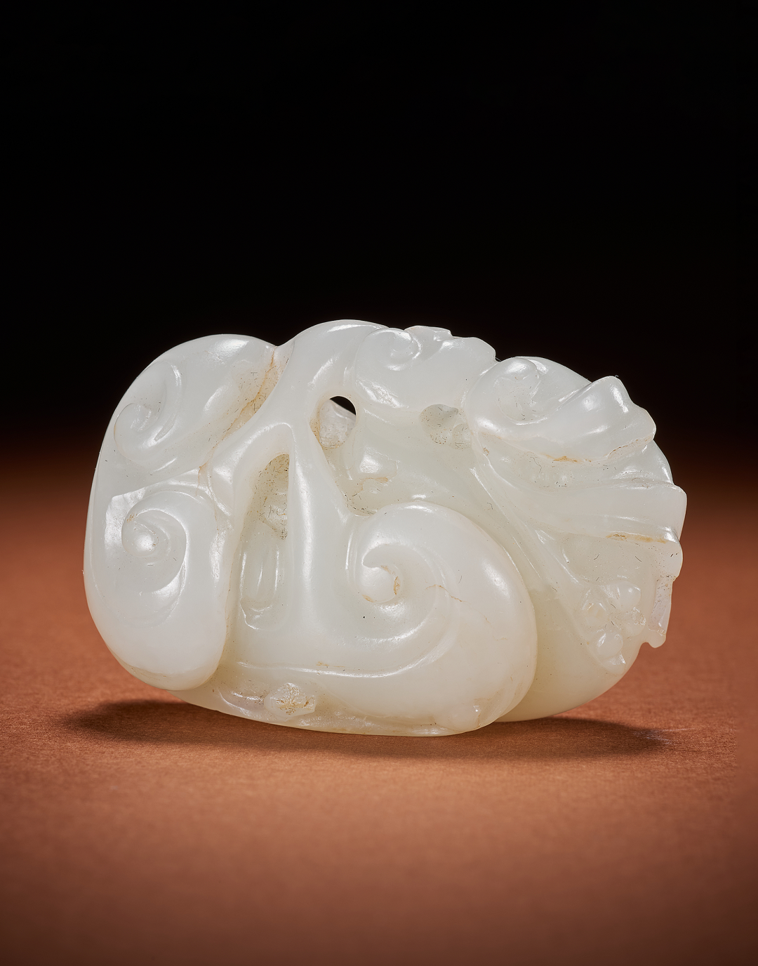 玉佩由白玉制成,洁白绵密,润如凝脂,呈扁平状,整体采用透雕双面工艺,中部琢龙纹,面部威严霸气,毛发飘逸,身躯婉转有力,弧线优美,气势非凡,四周雕刻缠枝花卉纹,茎蔓缠绕,花叶舒展,生动自然之美随之溢出。刀工流畅有利,造型精美别致,实属佳品。